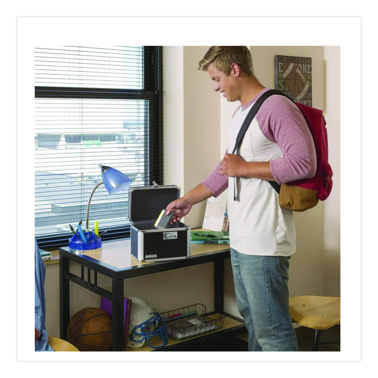 Stores wallets, cash, passports, birth certificate, CDs, DVDs and other valuables. Helps you to transport and protect the things that are important to you. Combination lock offers the freedom of keyless security. Durable plastic construction. Chrome-steel corners and aluminum trim deliver superior strength. Conveniently sized box with 0.14 L capacity. Rubber feet on the bottom section prevents skidding and scuffing, while keeping your security box firmly in place. Items Stored: Bills; Certificates/Licenses; Checks; Digital Storage Devices; Passports; Number of Compartments: 1; Color(s): Black; Color Family: Black.
