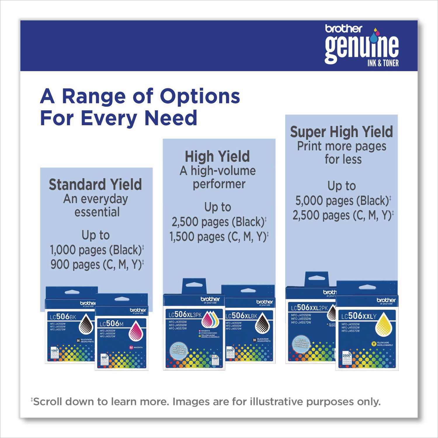 For everything you print, from airline tickets to business presentations, you can trust Brother Genuine Ink for consistent, premium performance with your Brother printer. The LC506 Standard Yield Ink Cartridges produce bold, sharp prints with rich black for up to 1,000 pages and vibrant colors up to 900 pages. Print Confidently with Brother Genuine LC506 Ink in your INKvestment 4355 and 4555 – the only brand we recommend for your Brother printer. Device Types: Inkjet Printer; Color(s): Magenta; Page-Yield: 900; Supply Type: Ink.