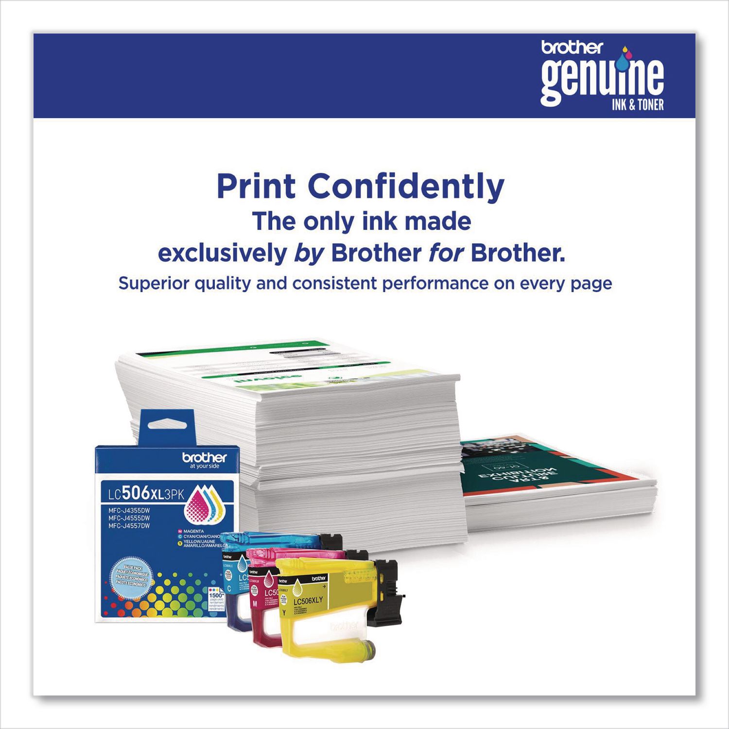 For everything you print, from airline tickets to business presentations, you can trust Brother Genuine Ink for consistent, premium performance with your Brother printer. The LC506XL High Yield Ink Cartridges produce vibrant, sharp prints with rich color for up to 1,500 pages and rich blacks up to 2,500 pages. Print Confidently with Brother Genuine LC506 Ink in your INKvestment 4355 and 4555 – the only brand we recommend for your Brother printer. Device Types: Inkjet Printer; Color(s): Cyan; Magenta; Yellow; Page-Yield: 1,500; Supply Type: Ink.