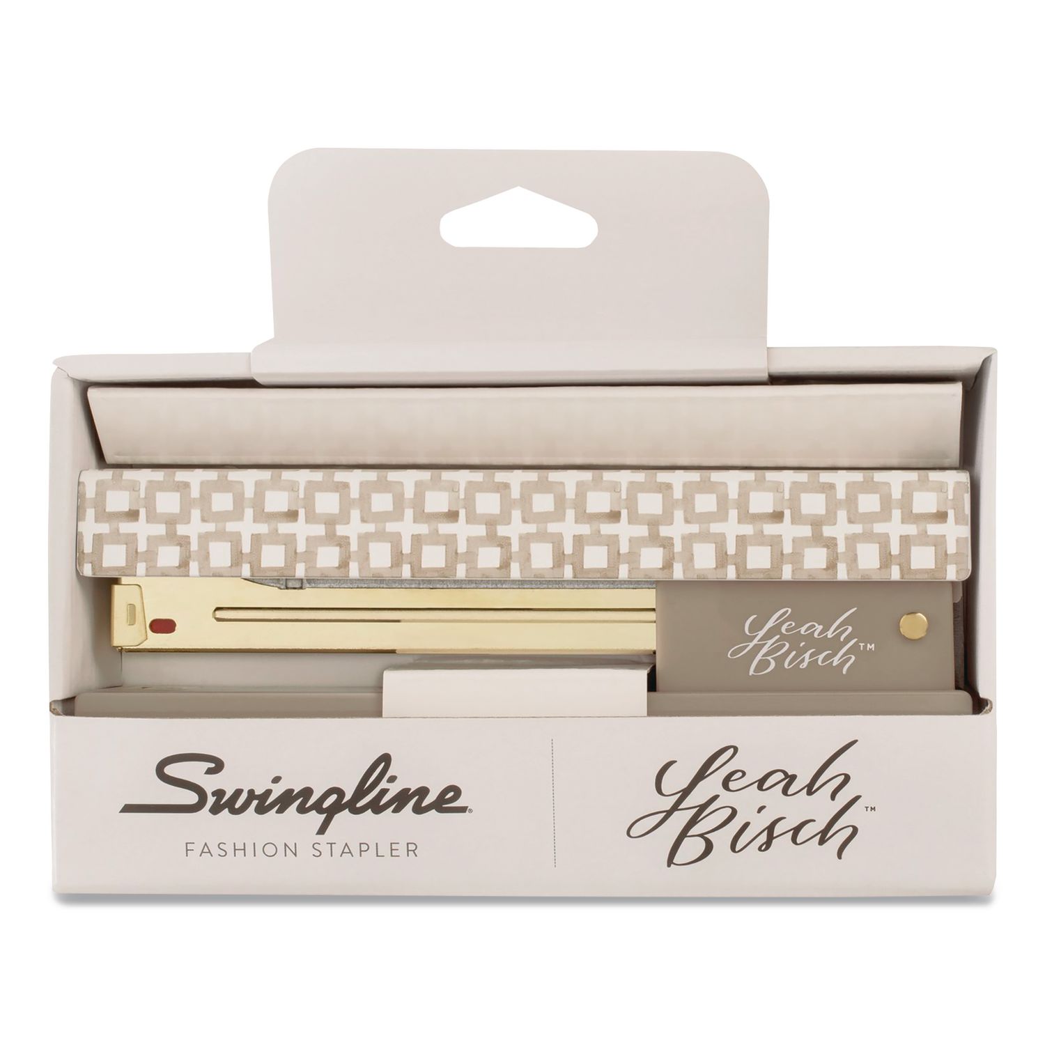The Swingline® Leah Bisch™ Tan-Tile Full Strip Stapler brings an element of unique graphic styling to every stapling task. Striking a fine balance between modern simplicity and lush maximalism, Leah Bisch’s artwork comes to life with a fresh, organic perspective, and this stapler’s tan-tile design is no exception. Stapler opens for tacking, and an adjustable anvil plate rotates to create temporary staples that point out for easy removal. Low-staple indicator lets you know when it’s time for a refill. For best results, use Swingline® Premium S.F.® 4® Staples. High Capacity Stapling: No; Flat Clinch Plate: No; Tacking: Yes; Staple Capacity: Full Strip (210 Staples).