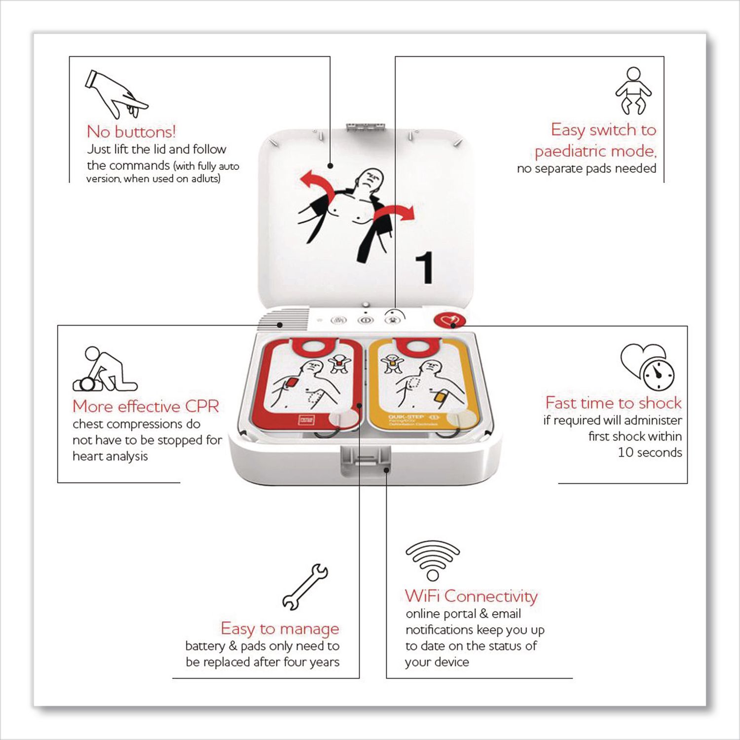 Sudden cardiac arrest can happen to anyone, anywhere, and every minute counts. The LIFEPAK® CR2 AED provides fast, easy-to-use defibrillation, putting lifesaving technology right where it’s needed and giving you confidence when it matters most. Semi-Automatic, English, Handle—Semi-automatic design with English prompts. Handle carrier. Battery Capacity: 4700 mAh; Battery Type: Lithium Metal; Event Documentation: Internal; Memory: 60 Minutes of Event Data.