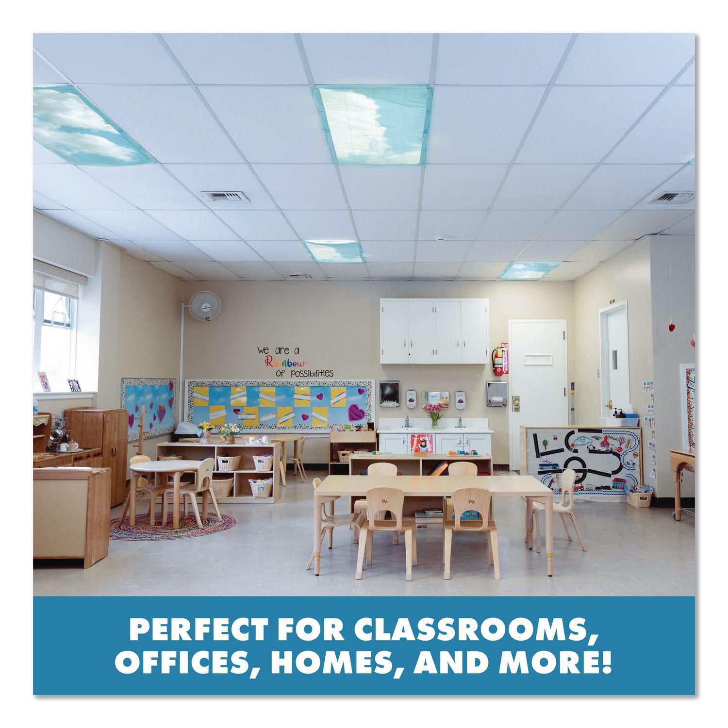 Fluorescent and LED lights are staples in many classrooms and offices, but their harsh glare and flickering light can cause eyestrain, headaches and anxiety. Cover your lights with these fabric panels and create a calm and soothing environment perfect for focusing and concentrating! Attach easily over standard ceiling fixtures with six sturdy, sewn-in magnets. For use with fluorescent and LED lights only. Essential classroom must-haves for elementary and preschool teachers. Lighting Effect Type: Dimming/Diffusion Filter; Graphic Design: Calming Clouds; Color(s): Blue/White; Color Family: Blue.