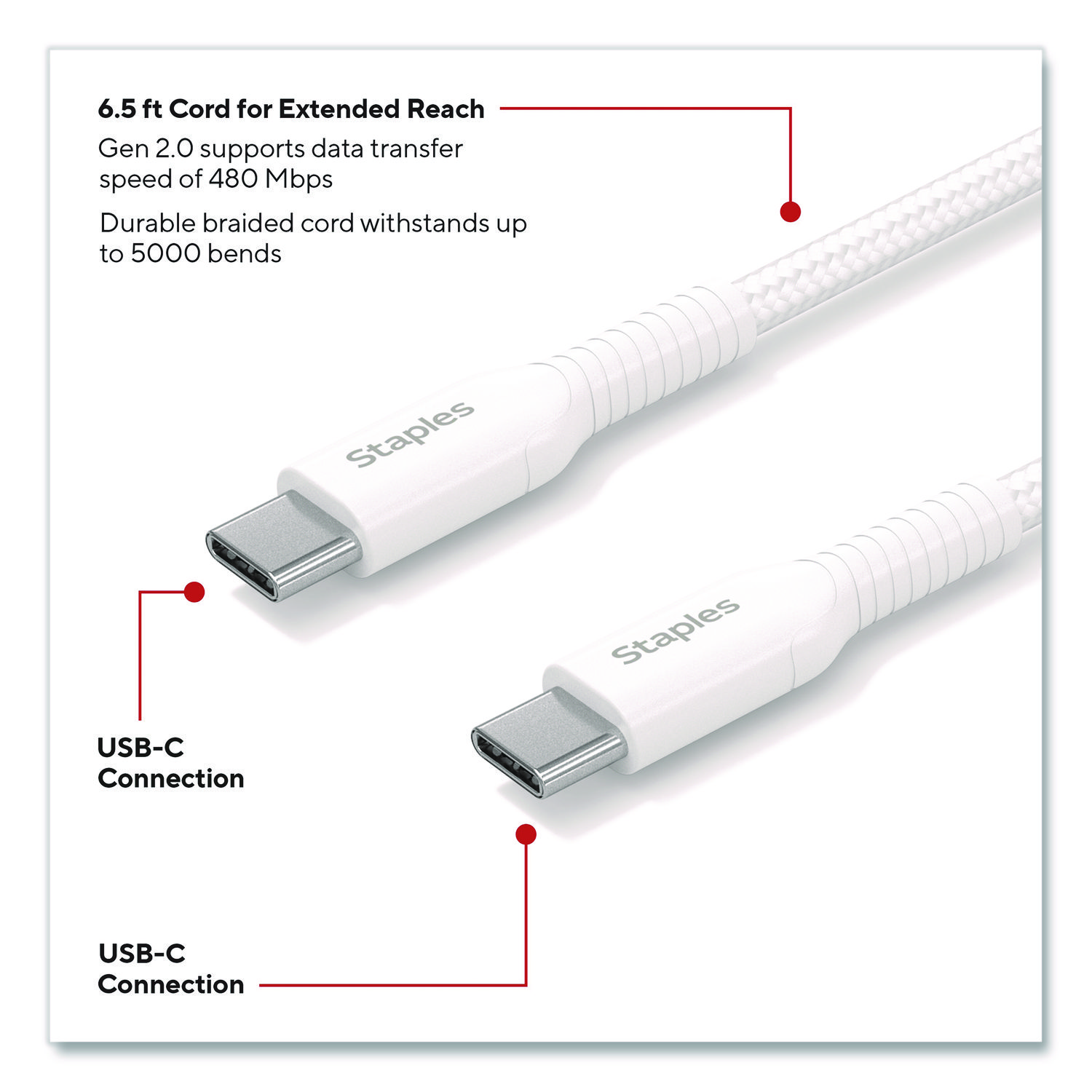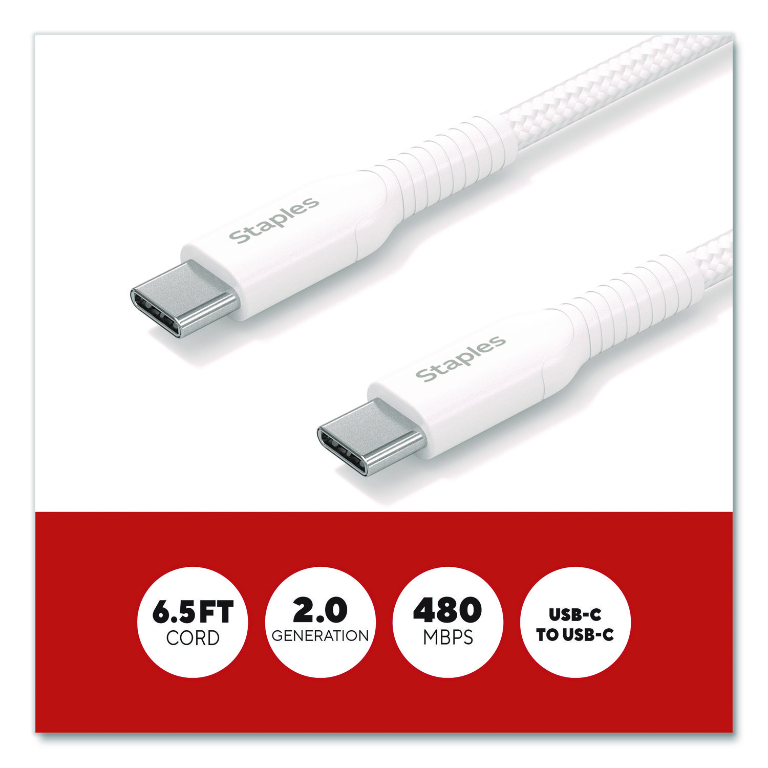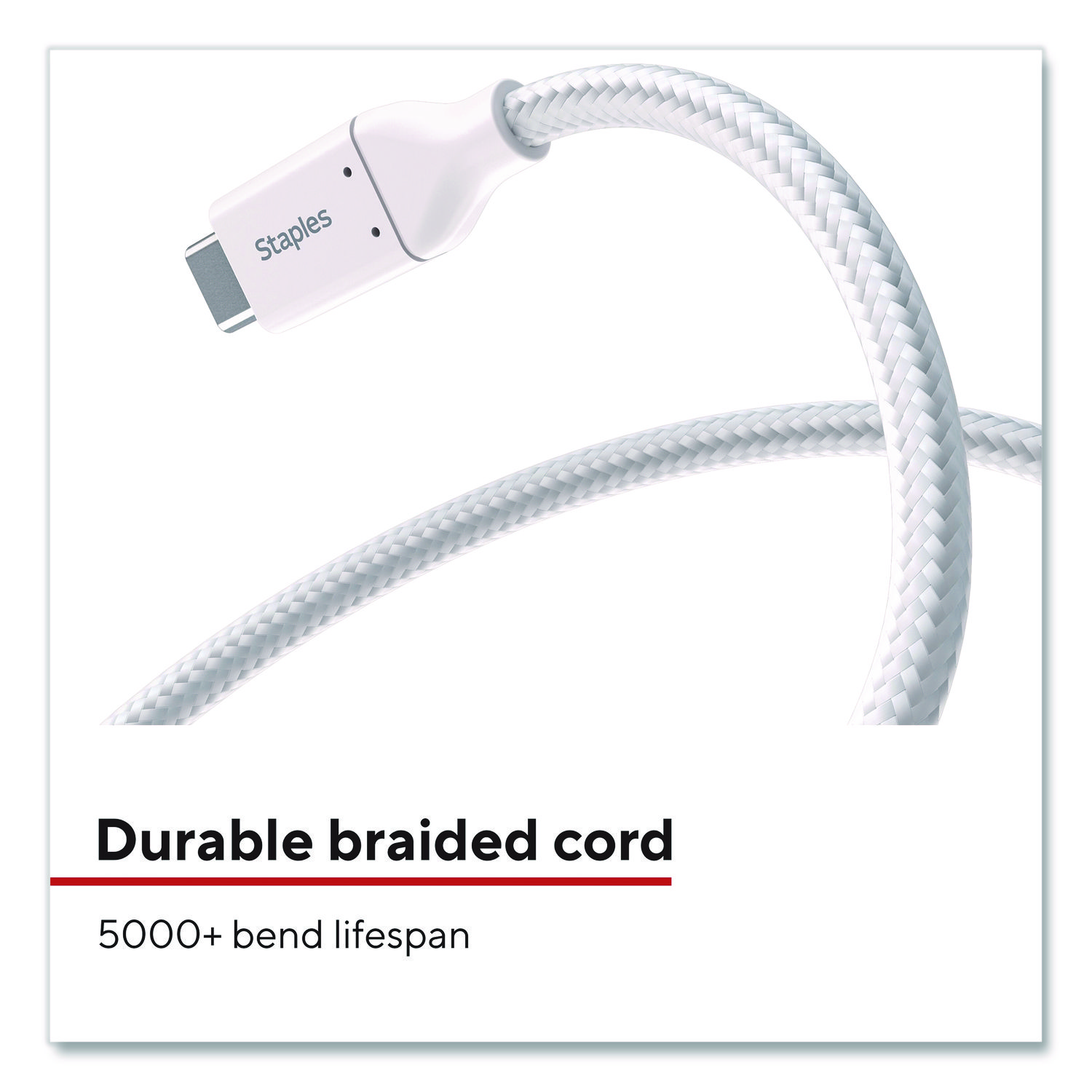 Power your Apple devices (Generation 14 and earlier) with this lasting StaplesĀ® USB-C to Lightning braided cable. The unique braided design provides extra durability, prevents tangles and has been tested to withstand up to 5,000 bends. The cable length gives extra reach when needed and is perfect for comfortably using devices while they charge. For Device Type: Mobile Devices; Adapter/Charger Type: Charging Cable; Connector/Port/Interface: USB-C; Color(s): White.