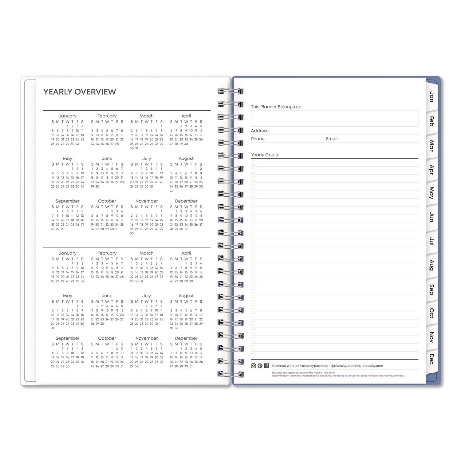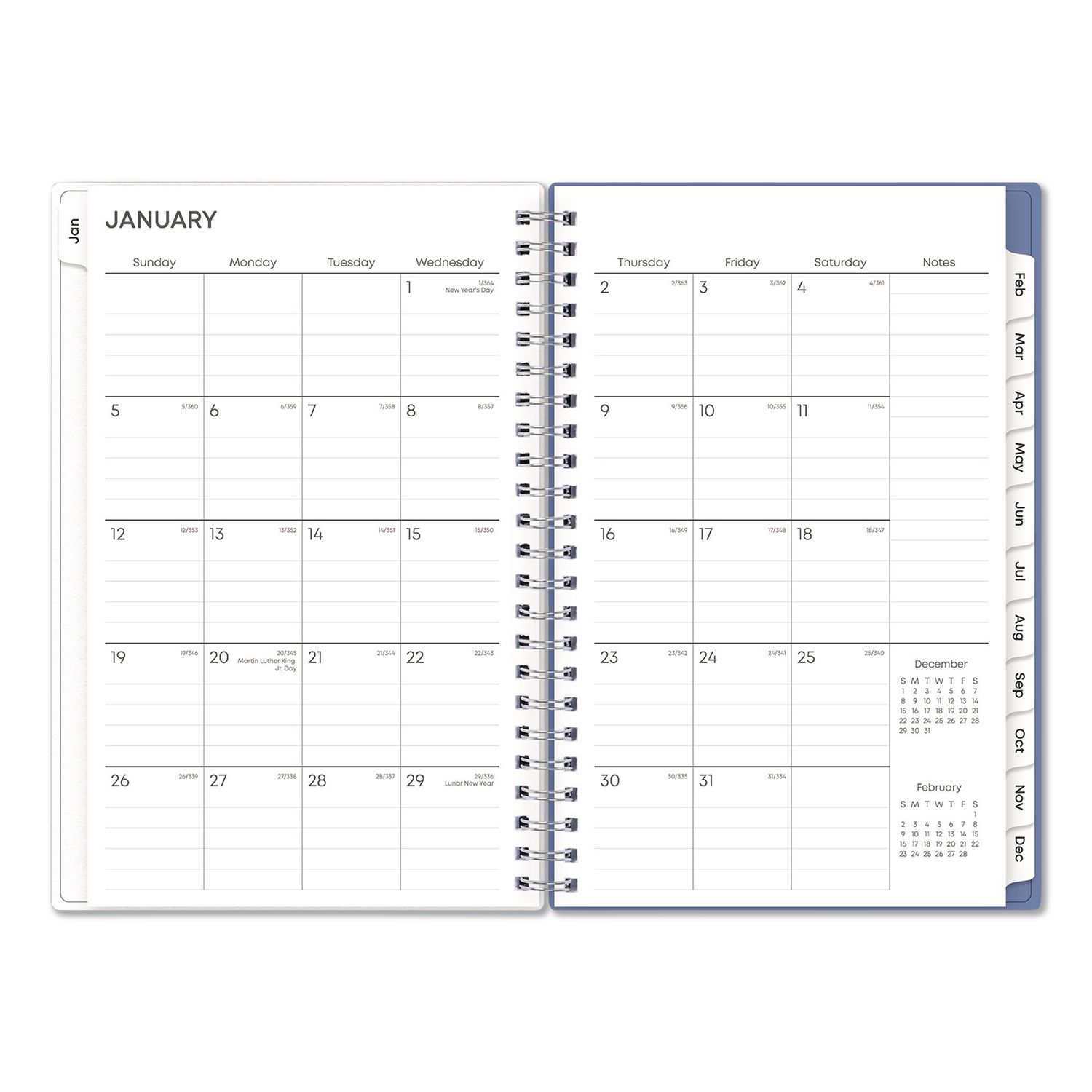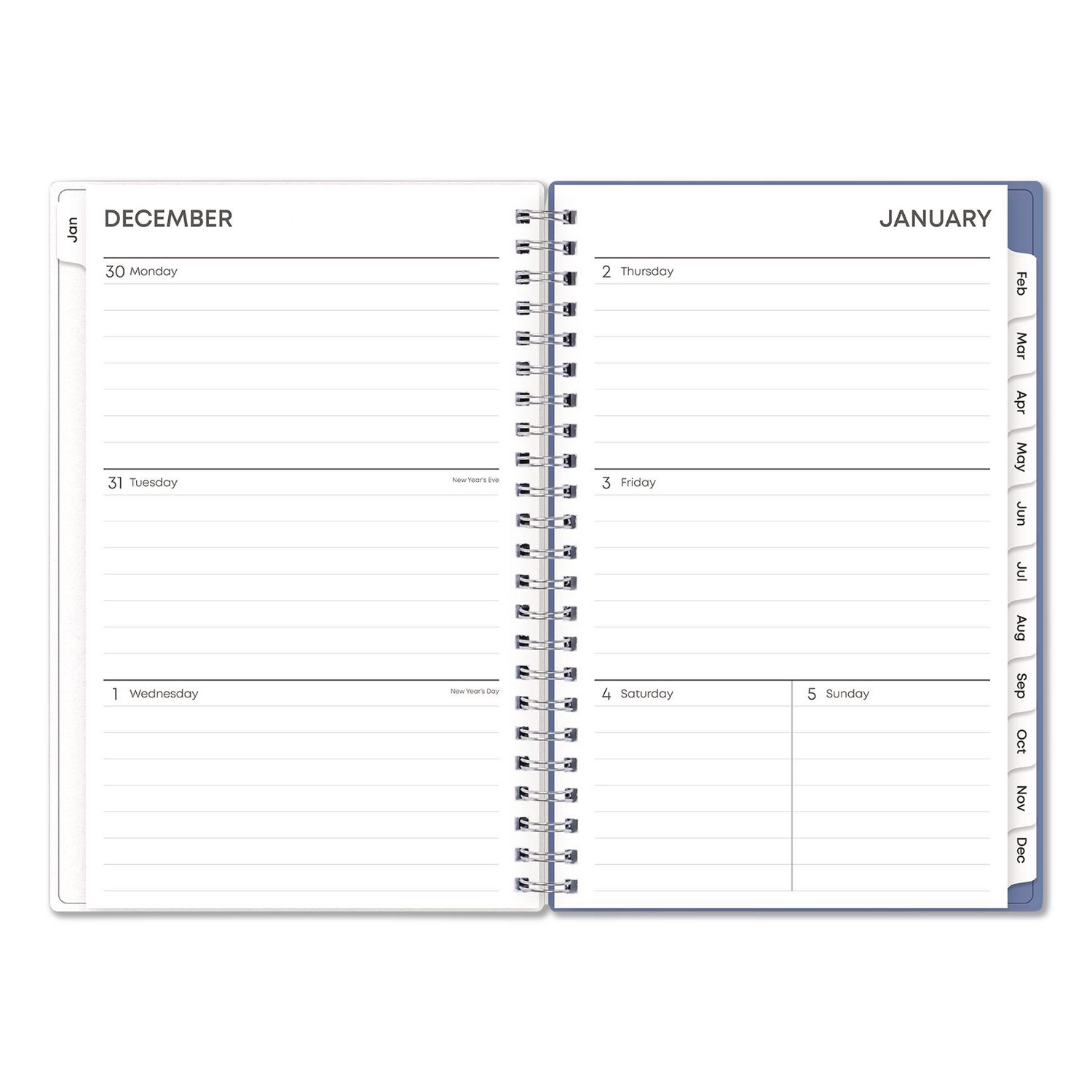 Add a touch of style to getting organized. Standard calendar year plus six bonus months of two-page spread per month. Weekly views per two-page spread offer ample writing space. Durable coated monthly calendar tabs allow for easy access to each month. Thick, premium acid-free pages reduce ink bleed-through. Features a double-sided paper storage pocket page. Durable frosted flexible front and solid back covers. Twin-wire binding finishes the look and offers easy page turning. Printed with soy-based ink. Dated: Yes; Academic Year: No; Calendar Format: Weekly/Monthly; Calendar Spread Format: One Week per Two-Page Spread; One Month per Two-Page Spread.