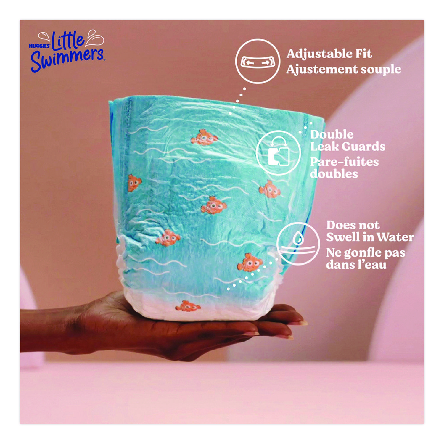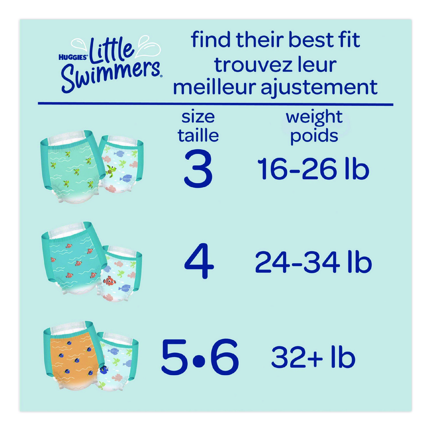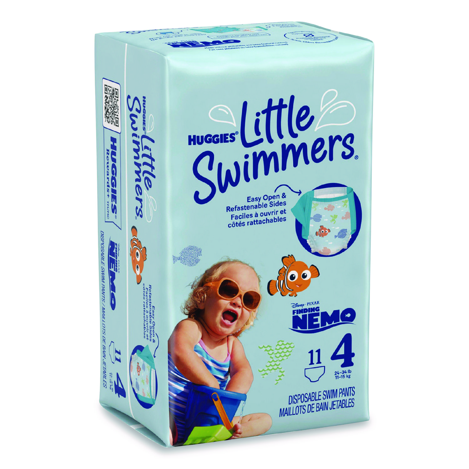 Enjoy worry-free water fun and let your baby make a splash in Huggies Little Swimmers swim diapers! Made with unique materials that won’t swell in water like regular baby diapers, Little Swimmers give your baby a comfortable fit when wet or dry. For secure protection in the water, Little Swimmers are designed with Double Leak Guards that fit snugly around your baby’s legs to help contain messes. Made to fit like swimwear, these Huggies diapers for swimming feature easy open, refastenable sides for an adjustable fit and quick diaper changes, whether you’re at the pool or on the beach. Plus, the soft, stretchy waistband make these swim pants comfortable for your baby. These swimming diapers are also made with no harsh ingredients and are free of fragrances, lotions, elemental chlorine bleaching and natural rubber latex. Features two Disney·Pixar Finding Nemo designs your child will love. Perfect for the pool, beach, splash park and more! Diaper Style: Swim Diapers; Diaper Size: 4; Baby Weight Range Max [Max]: 34 lbs; Baby Weight Range Min [Min]: 24 lbs.