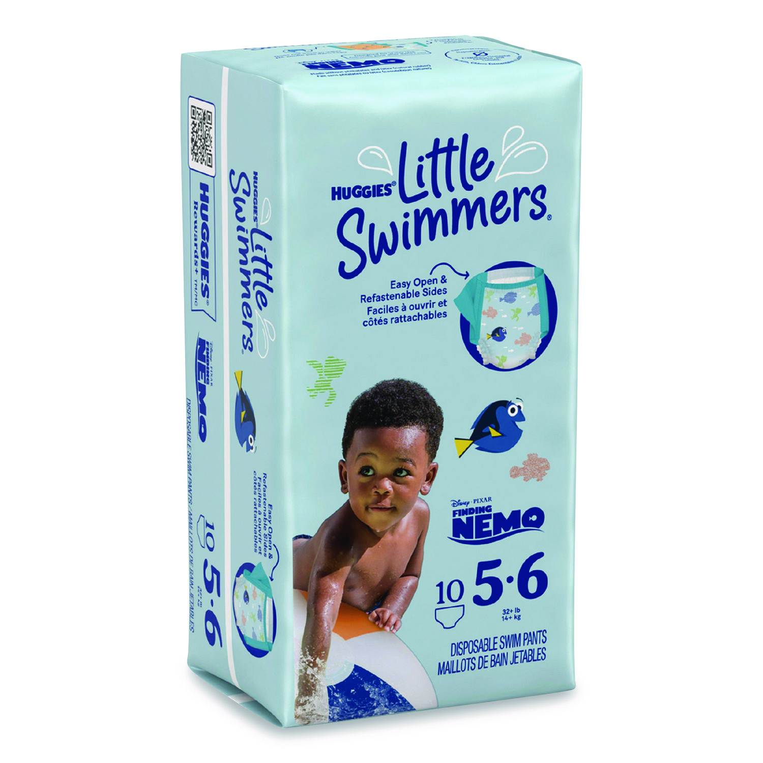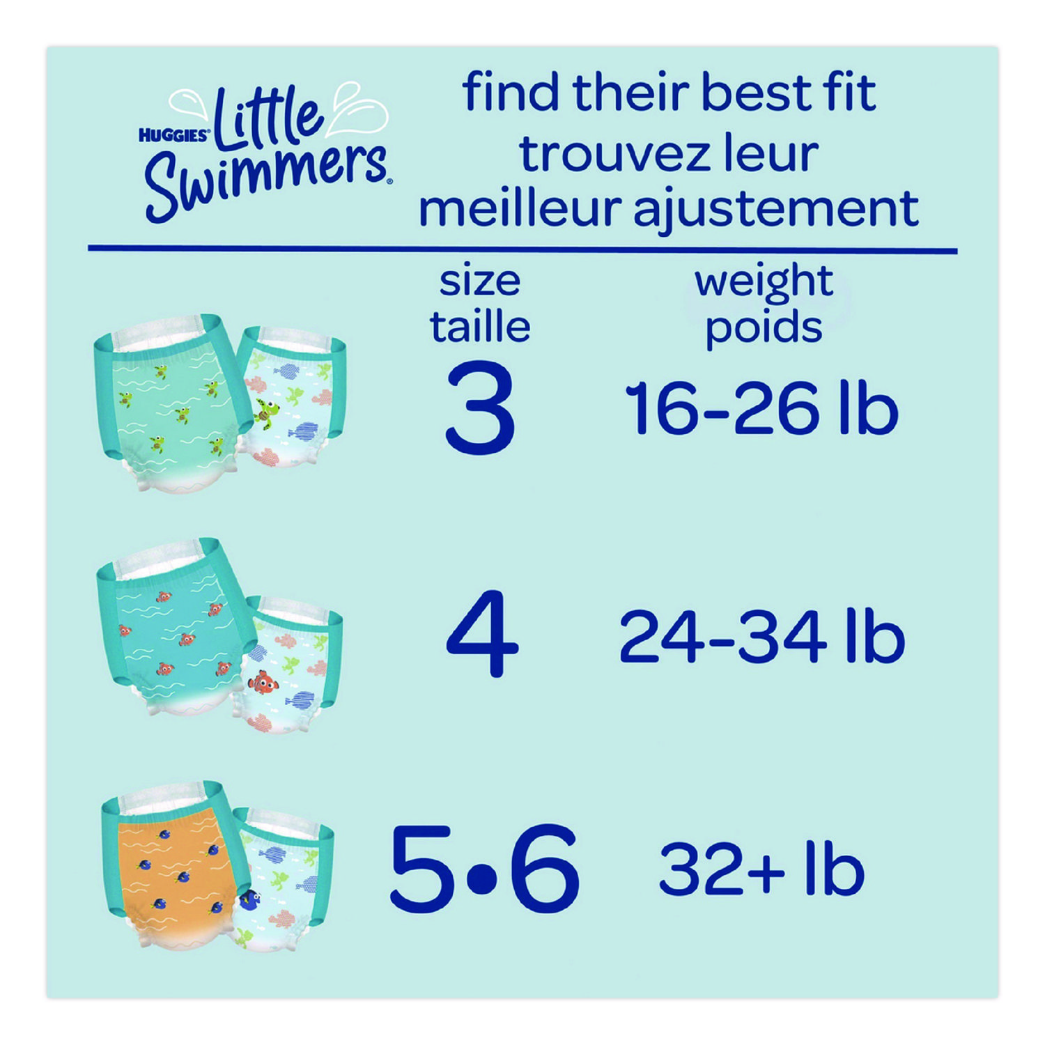 Enjoy worry-free water fun and let your baby make a splash in Huggies Little Swimmers swim diapers! Made with unique materials that won’t swell in water like regular baby diapers, Little Swimmers give your baby a comfortable fit when wet or dry. For secure protection in the water, Little Swimmers are designed with Double Leak Guards that fit snugly around your baby’s legs to help contain messes. Made to fit like swimwear, these Huggies diapers for swimming feature easy open, refastenable sides for an adjustable fit and quick diaper changes, whether you’re at the pool or on the beach. Plus, the soft, stretchy waistband make these swim pants comfortable for your baby. These swimming diapers are also made with no harsh ingredients and are free of fragrances, lotions, elemental chlorine bleaching and natural rubber latex. Features two Disney·Pixar Finding Nemo designs your child will love. Perfect for the pool, beach, splash park and more! Diaper Style: Swim Diapers; Diaper Size: 5-6; Baby Weight Range Max [Max]: 32 lbs; Latex Free: No.