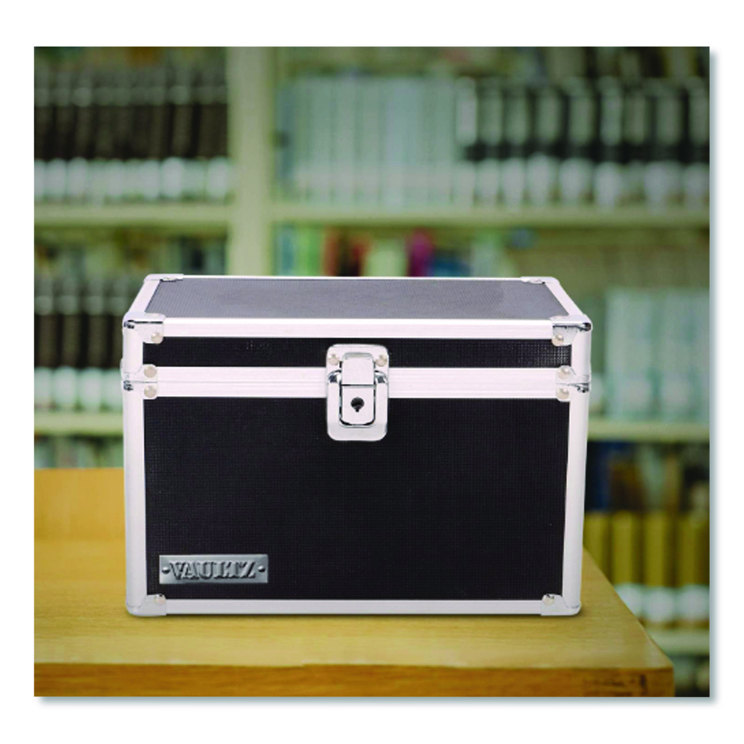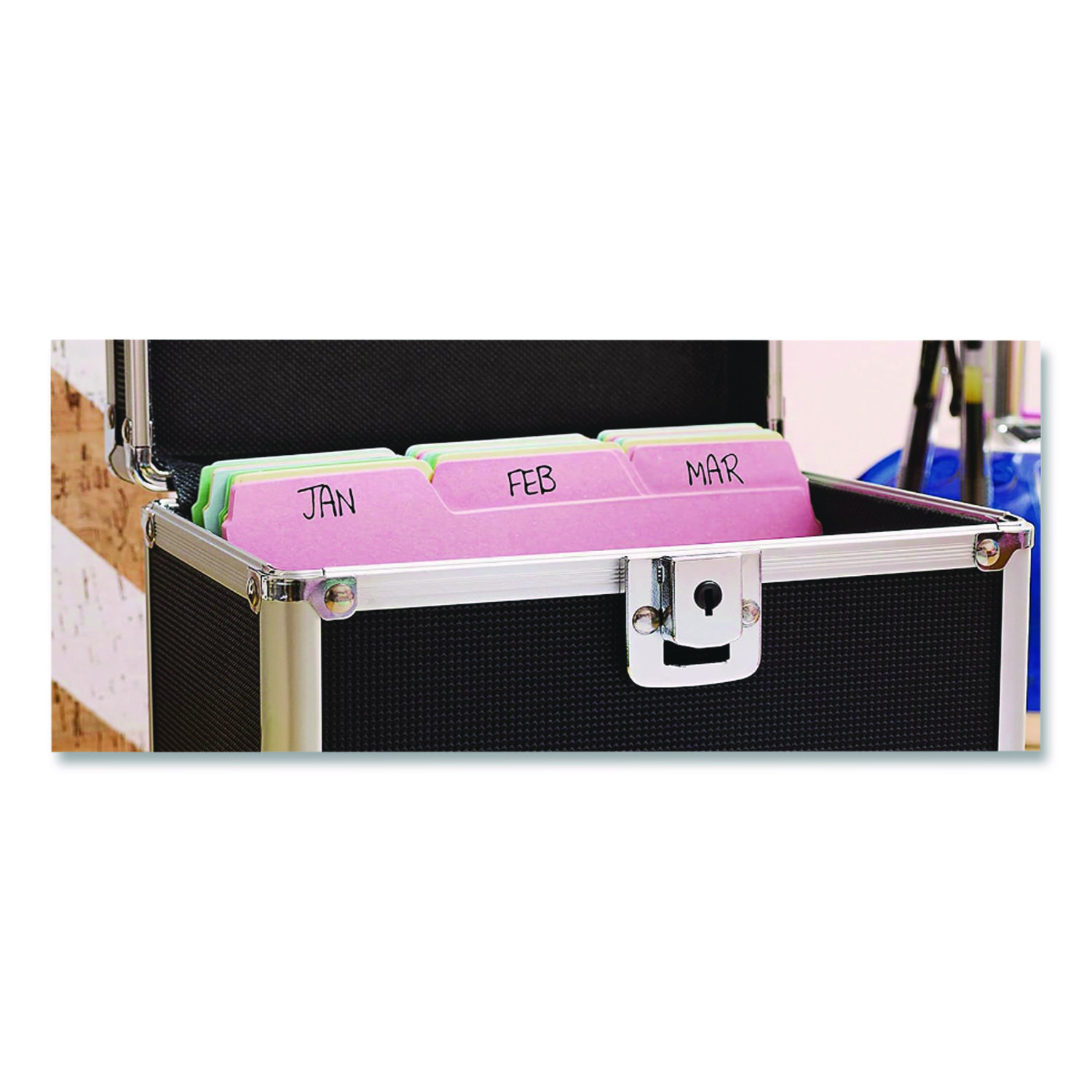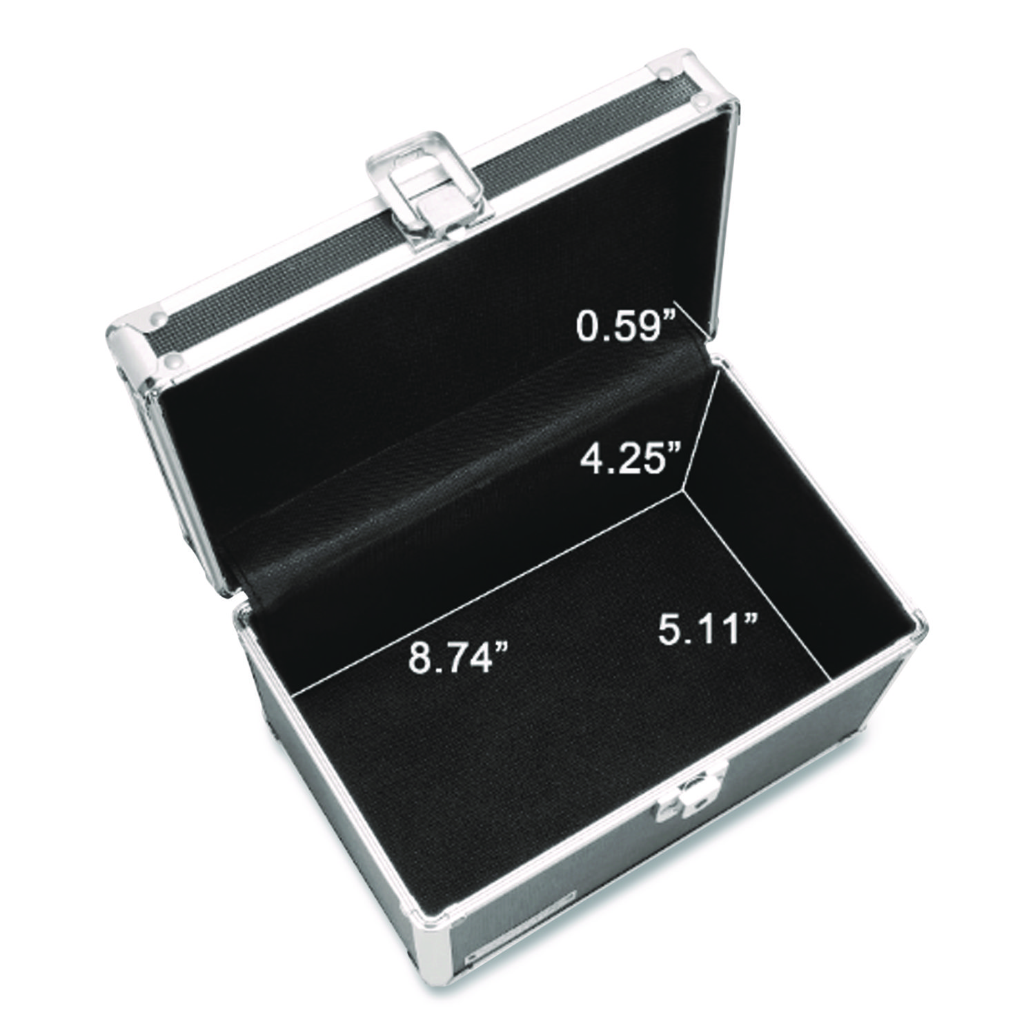 Heavy-duty file safely holds index cards. Ideal for important photos, documents and supplies, too. Sturdy key lock keeps contents secure. Aluminum trim reinforcements plus chrome steel corners provide additional security. Soft felt interior. Card Holder Type: Card File Box With Hinged Lid; Card Capacity: 550; For Card Size: 5 x 8; Color(s): Black.
