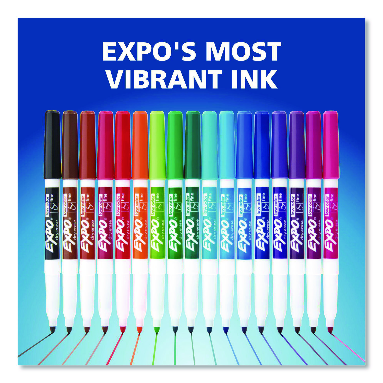 Create high impact marks and track, schedule and present clearly. High-quality ink-delivery system ensures consistent, skip-free results, while bold, vivid colors make it easy to see what’s written from a distance. EXPO® Low-Odor Dry-Erase Markers always erase cleanly and easily from whiteboards and other non-porous surfaces such as porcelain, melamine and glass, simply with a dry cloth or a standard whiteboard eraser; but for optimal results, EXPO® whiteboard erasers are recommended. As their ink is specially designed to be low-odor and quick drying, they’re the perfect dry erase marker for use just about everywhere: classrooms, offices, homes, boardrooms and more. Marker Ink Type: Dry Erase; Marker Tip Type: Bullet; Marker Tip Size (text): Fine; Marker Color(s): Blue.