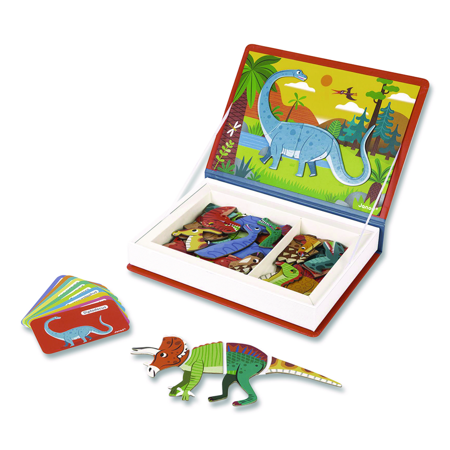 Cardboard magnetic educational game based on a theme; composed of many magnets and cards. Once the book is opened, the object of the game is to use the magnetic background for the placement of magnets to recreate the scene indicated on the card. Children can also have fun mixing the various interchangeable pieces to create their own stories. Educational learning aid, enhancing cognition and dexterity. Dinosaurs. Subject Area: Natural Science; Specific Subject: Dinosaurs; Age Recommendation: Ages 3 to 8; Grades: Grades Pre-K to 3.