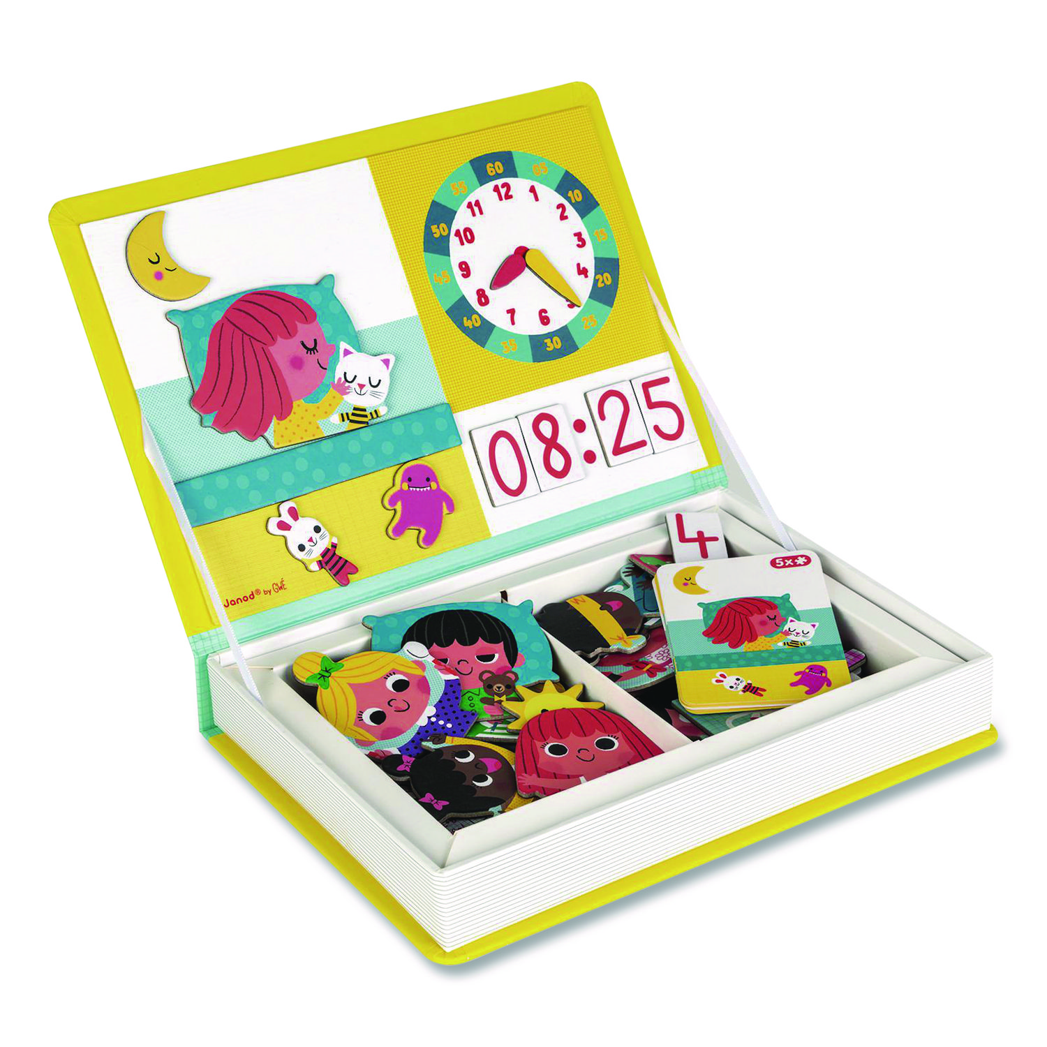 Cardboard magnetic educational game based on a theme; composed of many magnets and cards. Once the book is opened, the object of the game is to use the magnetic background for the placement of magnets to recreate the scene indicated on the card. Children can also have fun mixing the various interchangeable pieces to create their own stories. Educational learning aid, enhancing cognition and dexterity. Learn To Tell Time. Subject Area: Life Skills; Specific Subject: Learn To Tell Time; Age Recommendation: Ages 3 to 8; Grades: Grades Pre-K to 3.
