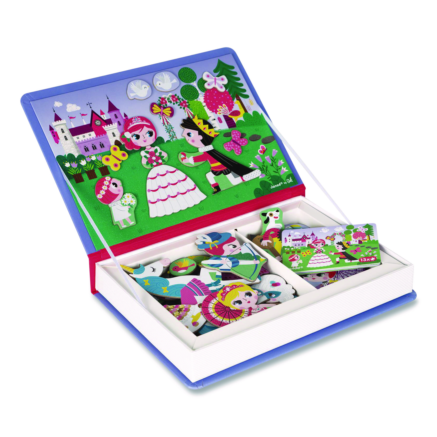 Cardboard magnetic educational game based on a theme; composed of many magnets and cards. Once the book is opened, the object of the game is to use the magnetic background for the placement of magnets to recreate the scene indicated on the card. Children can also have fun mixing the various interchangeable pieces to create their own stories. Educational learning aid, enhancing cognition and dexterity. Princesses. Subject Area: Life Skills; Special Interest; Specific Subject: Princesses; Age Recommendation: Ages 3 to 8; Grades: Grades Pre-K to 3.