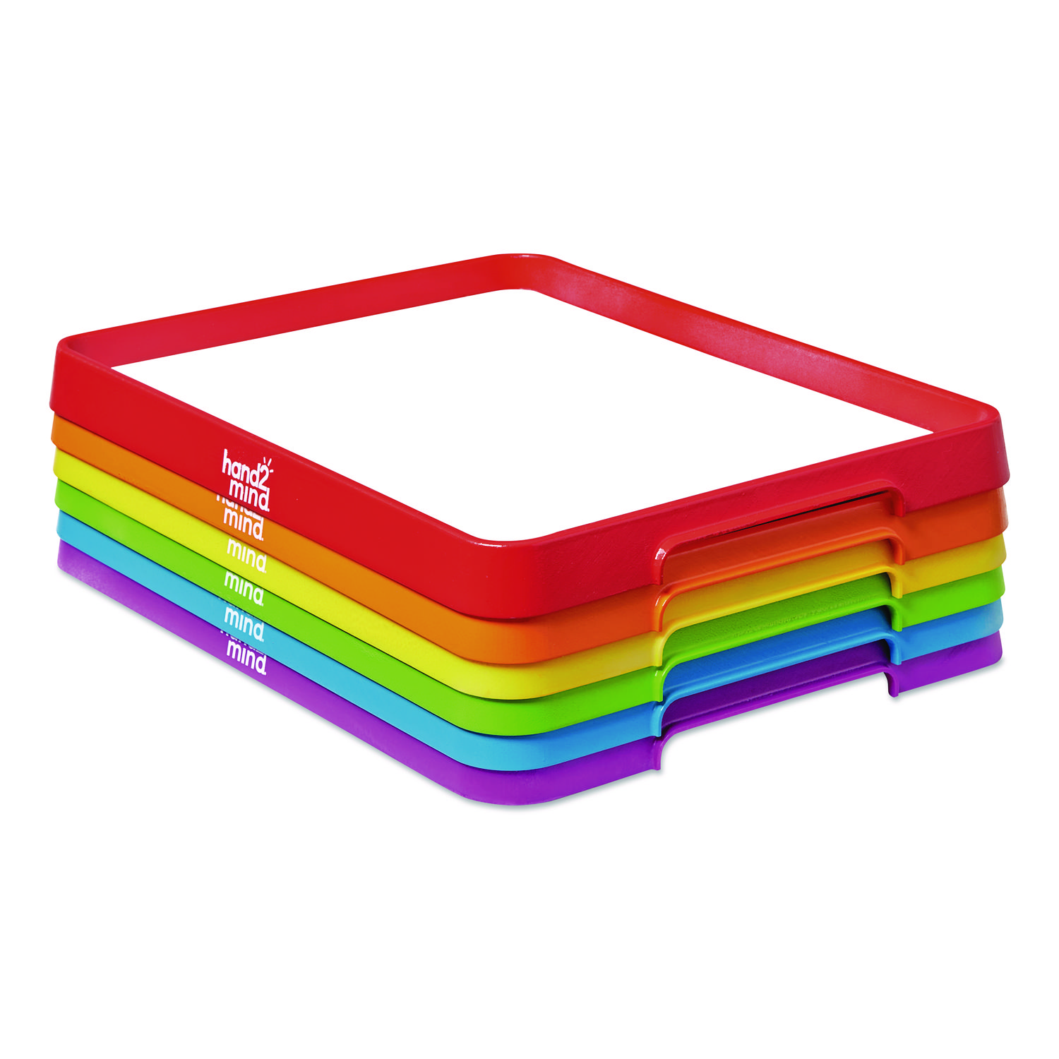 Perfect for hands-on learning, these colorful trays are a dynamic tool for any classroom! Each tray has a magnetic, write-on/wipe-off surface that can be used for a variety of activities. Trays stack for easy storage, making it simple to keep your classroom organized and clutter-free. Handles make transportation a breeze in the classroom, and allow little hands to easily carry each tray. Set of Six—Assorted frame colors. Board Surface Type(s): Dry Erase; Magnetic Board Surface: Yes; Surface Use Rating: Moderate Use; Surface Color: White.