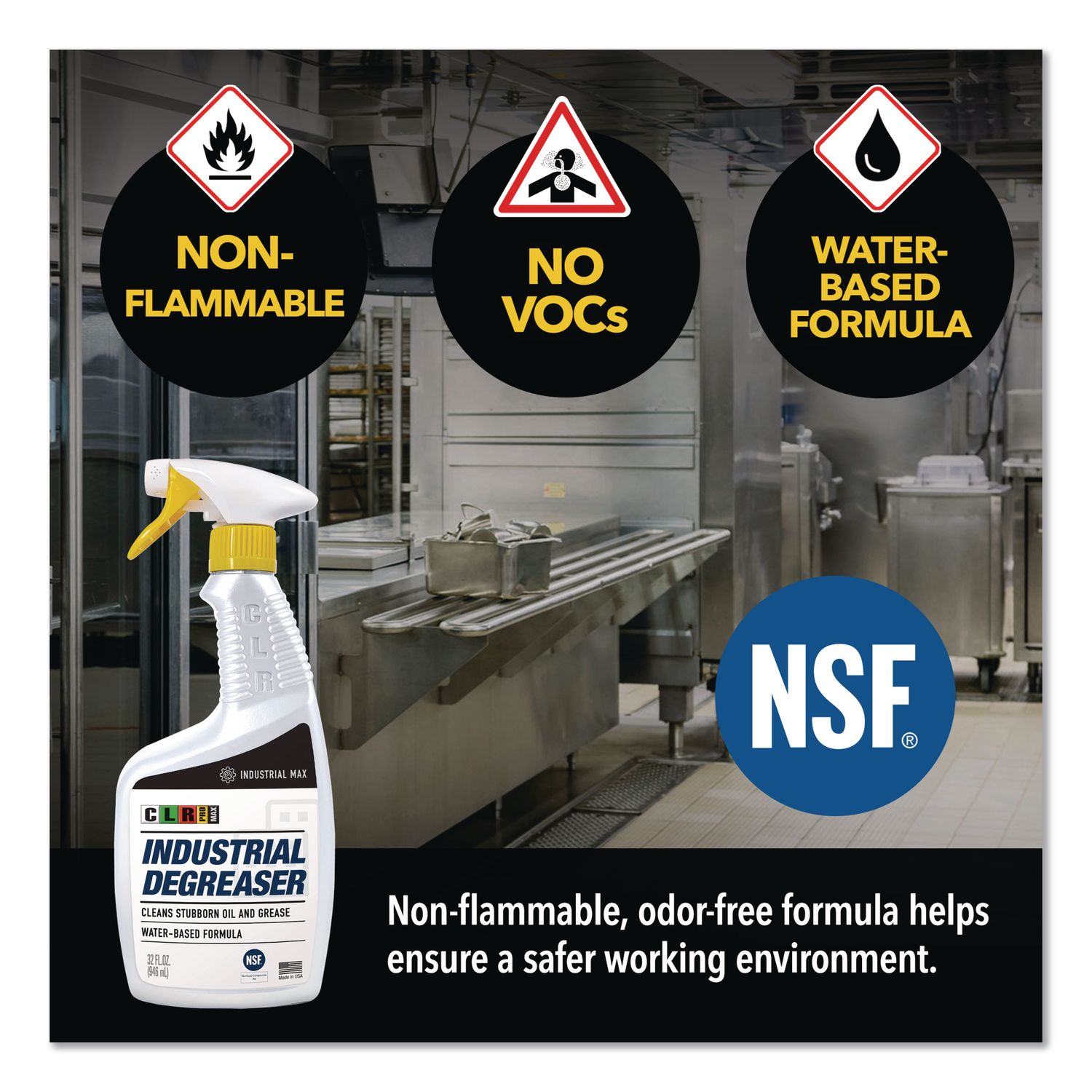 Built for heavy grease, oil, grime and tar removal, CLR PRO® MAX® Industrial Degreaser effectively penetrates and dissolves heavy stains, saving time and effort on degreasing jobs. Concentrated formula allows users to choose the strength they need to get the job done properly. The water-based formula is non-flammable, has no VOCs, and contains no acids, abrasive or petroleum solvents. Application: Degreaser; Applicable Material: Appliances; Commercial Ovens; Concrete Floors; Engines; Floor Scrubbers; Grill Hoods; Heat Exchangers HVAC Equipment; Traps; Trash Containers; Chemical Compound: Alkyl Ethoxylate Nonionic Surfactant Proprietary Blend; Sodium Xylene Sulfonate; Sodium Metasilicate; Dirt Types: Grease; Grime; Oil.