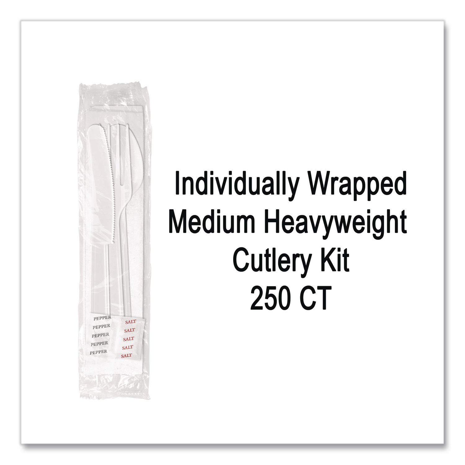 Medium Heavyweight Cutlery Kit, Fork/Knife/Napkin/Pepper/Salt/Spoon, Plastic, White, 250/Carton