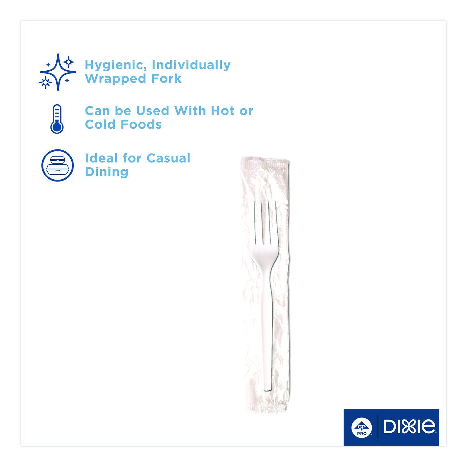 The Dixie® Plastic Cutlery offers reliable durability for both hot and cold foods at an exceptional value. Their shatter-resistant construction makes them ideal for a wide range of casual dining uses; perfect for lighter foods. Their compact packaging requires minimal storage space. Strong and rigid utensils perfect for your finest feast. Excellent for quick-service, convenience applications. Well-suited for salads, picnic sides and party treats. Flexible and shatter-resistant. No short counts or broken pieces, guaranteed. Utensils Type: Fork; Material Type: Plastic; Material(s): Polystyrene; Color(s): White.