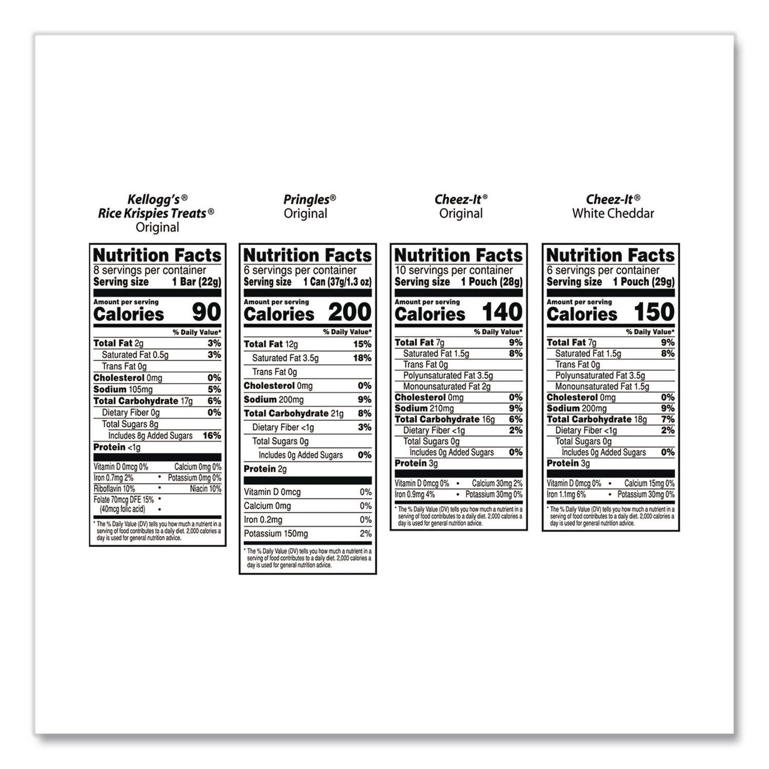 Satisfy all of your cravings with this irresistible assortment of snacks. Its delicious mix of sweet and salty favorites makes snack time more enjoyable whether it’s early in the morning or late in the afternoon. Individual packaging ensures maximum freshness and is great for on-the-go enjoyment. Assorted snacks are perfect for boosting office morale, impressing guests and more. Variety pack includes Cheez-It® Original Crackers, Cheez-It® White Cheddar Crackers, Pringles Potato Crisps and Rice Krispies Treats. Food Type: Crackers; Flavor: Cheez-It Original; Cheez-It White Cheddar; Pringles Potato Crisps; Rice Krispies Treats; Capacity (Weight): 1 oz; 1.02 oz; 1.3 oz; 0.78 oz; Sugar Free: No.