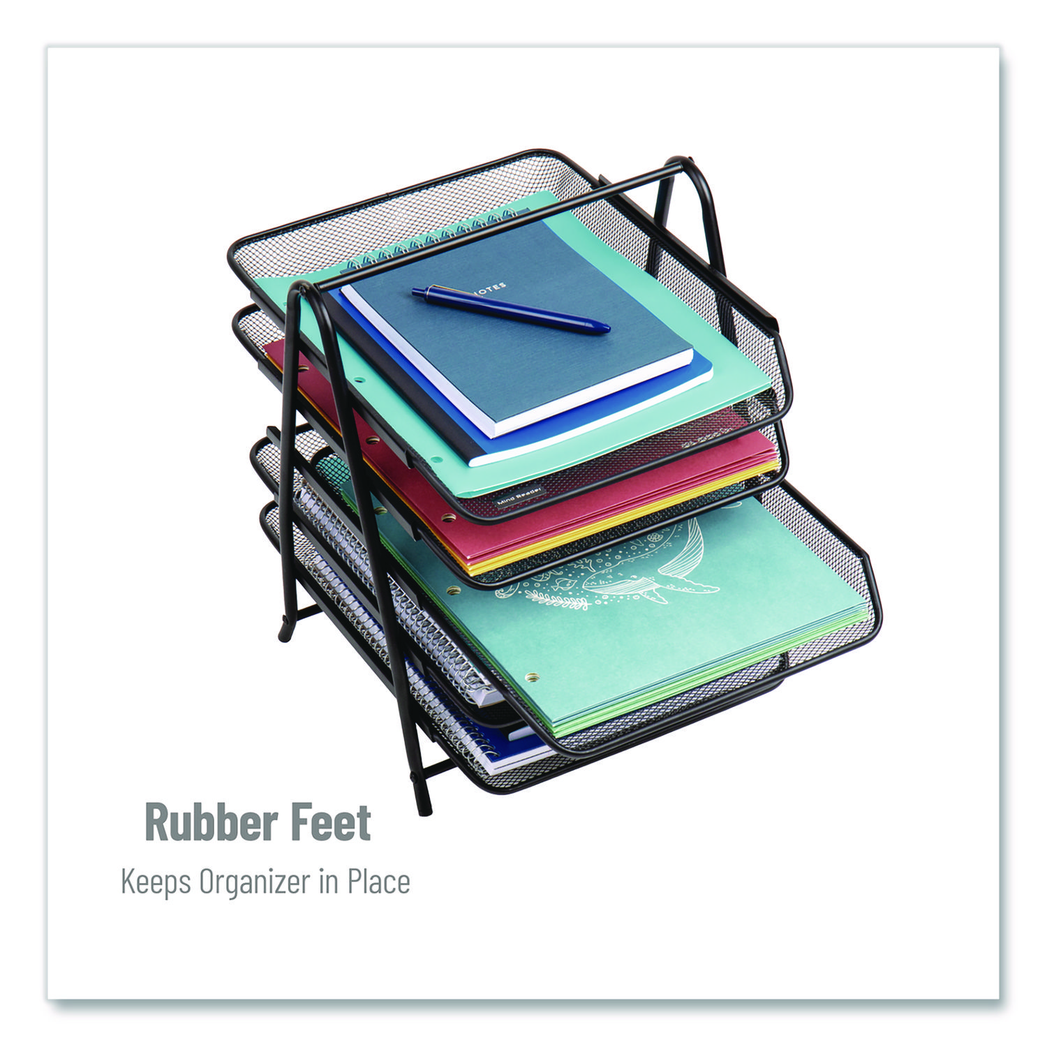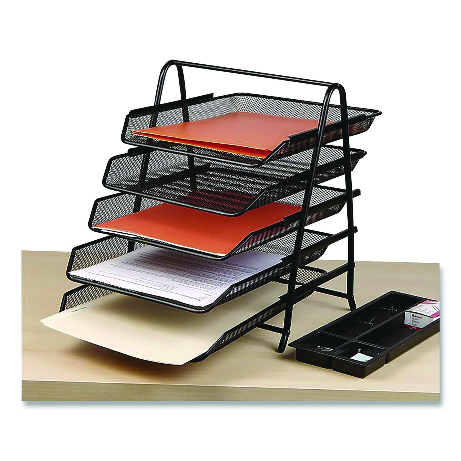 Multi-tiered design provides ample storage capacity for storing and organizing a variety of items such as files, mail, documents, folders, bills and letters. Declutter your desk or counter and keep everything within easy reach. The attached rubber feet ensure that the organizer stays in place. Access your items with confidence, knowing that the organizer won’t slip or move around on your desk. The rubber feet also help protect your desk surface from scratches. With a convenient carrying handle, this tray organizer is easily portable. You can take it with you wherever you work, whether it’s in a college dorm, office, home, school, conference room, business, hotel or any other setting. This versatile organizer streamlines your space and keeps papers in place, making it an ideal solution for improving organization and efficiency. Accommodates standard-sized documents and provides ample storage space while remaining compact. 5-Tier. Number of Compartments: 5; For File Size: Letter; Load Orientation: Front; Color(s): Black.