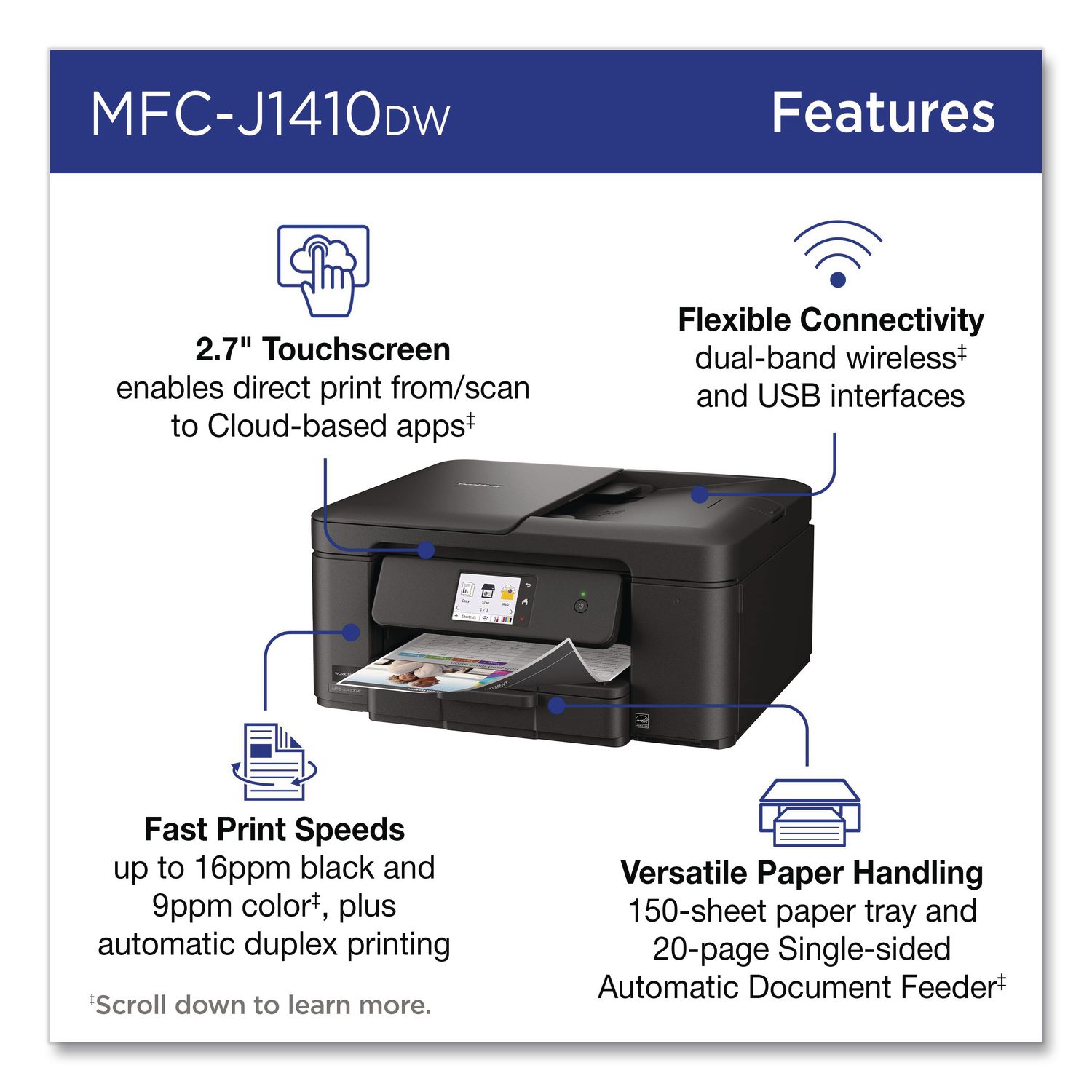 Experience true reliability and ease of use with the Brother Work Smart 1410 Wireless Color Inkjet All-in-One Printer. A 2.7″ color touchscreen display lets you connect to popular Cloud apps directly from your printer. Automatic duplex (two-sided) printing, a 20-sheet single-sided automatic document feeder (ADF), and a 150-page paper tray bring modern convenience to this compact printer. Engineered to produce great prints, this color inkjet printer outputs vibrant colors and bold, rich blacks at fast print speeds, and Page Gauge monitors your ink usage so you know when you’re running low. When paired with the Brother Mobile Connect app, setup is quick and easy – plus, you can print from virtually anywhere on your mobile device. Machine Functions: Copy; Print; Scan; Printing Type: Inkjet; Maximum Print Speed (Black): 16 ppm; Maximum Print Speed (Color): 9 ppm.