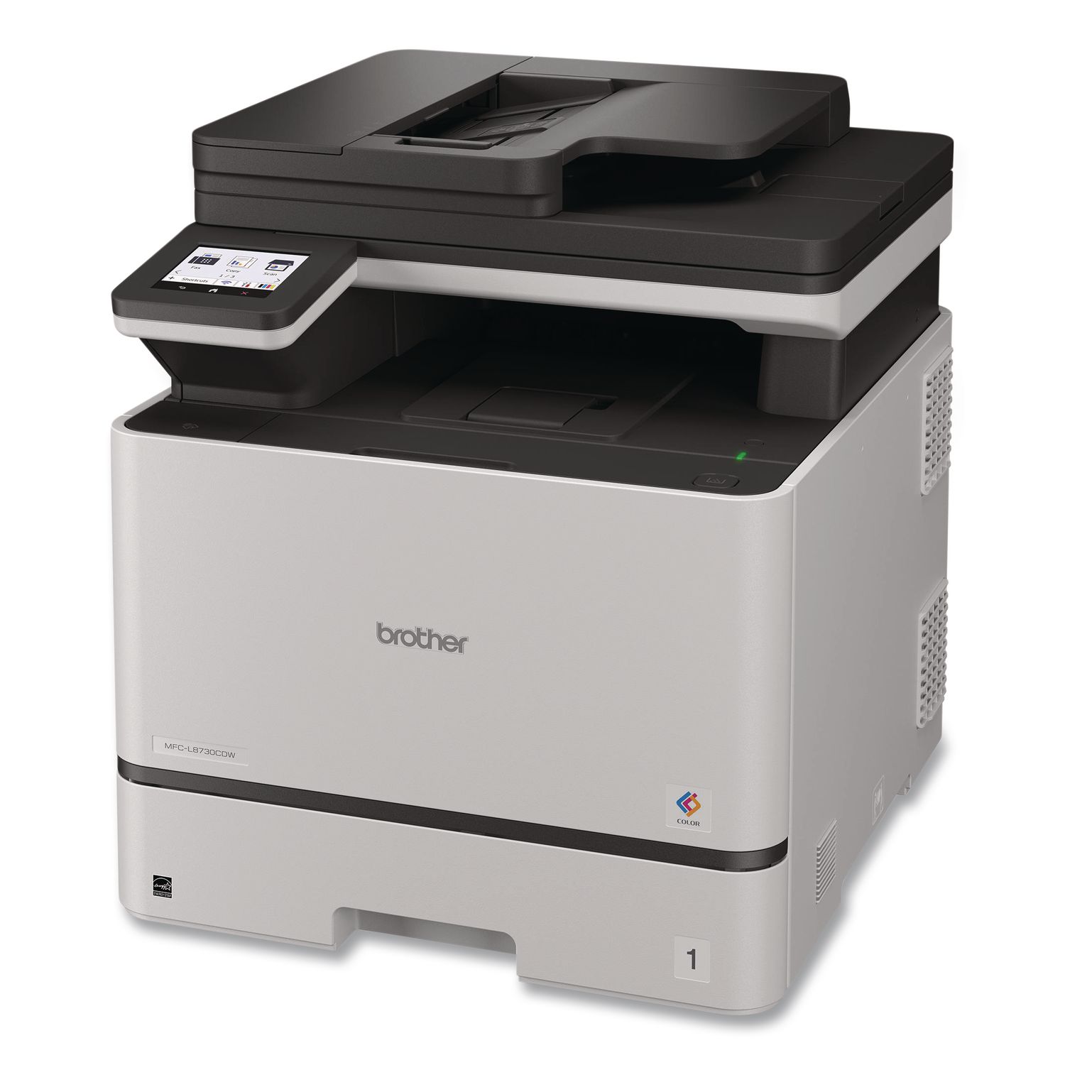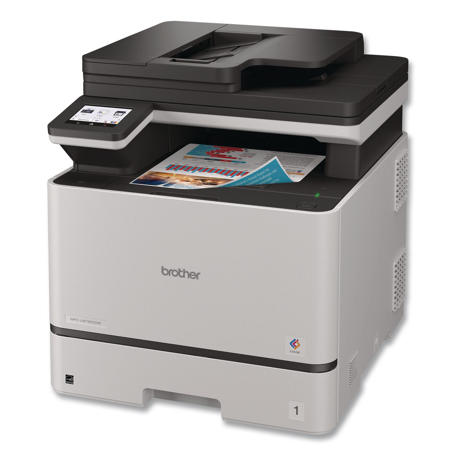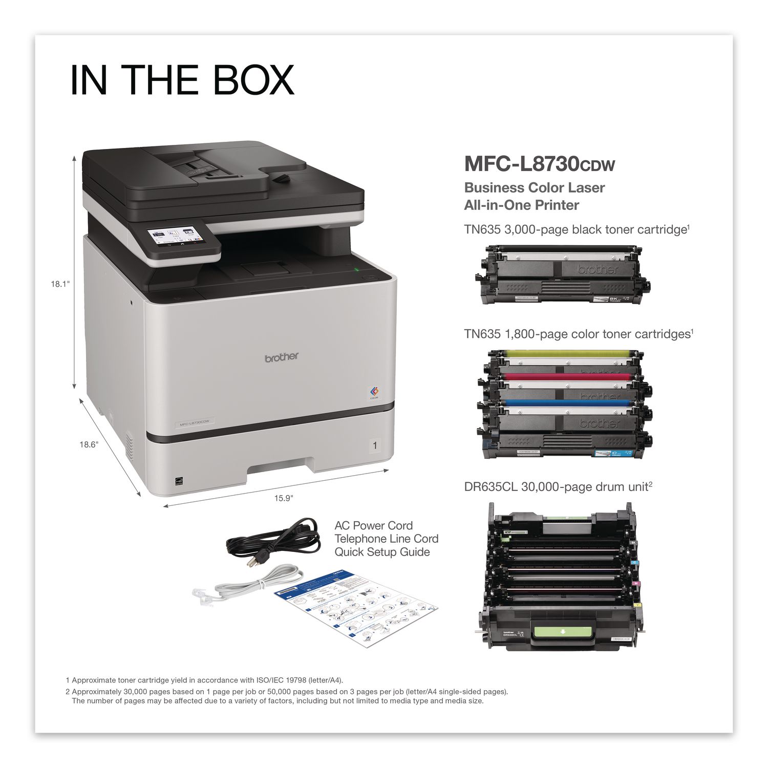 The Brother MFC-L8730CDW Business Color Laser All-in-One Printer is ideal for business work teams, supporting maximum productivity in high-demand environments with reliable performance. Fast printing and copying with lifelike color and sharp black output for professional documents, presentations and marketing collateral, plus advanced scanning capabilities. Maximize printing budgets with included Brother Genuine standard yield toner cartridges and achieve cost-effective printing using the TN635XL high yield replacement toner cartridges. Triple layer security features help to keep the device secure, protect documents in transit, and safeguard against network intrusions. The printer includes dual band (2.4GHz/5GHz) wireless and Gigabit Ethernet for wireless or wired networks, plus convenient mobile device printing and scanning. Machine Functions: Copy; Fax; Print; Scan; Printing Type: Laser; Maximum Print Speed (Black): 33 ppm; Maximum Print Speed (Color): 33 ppm.