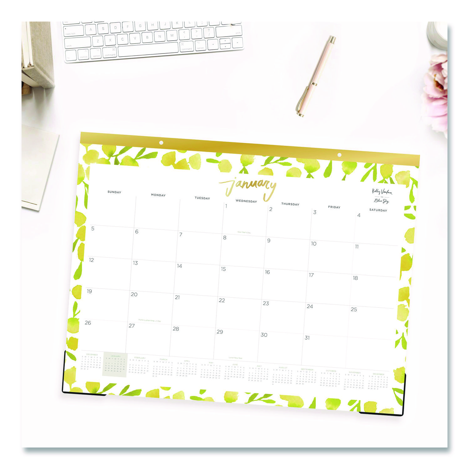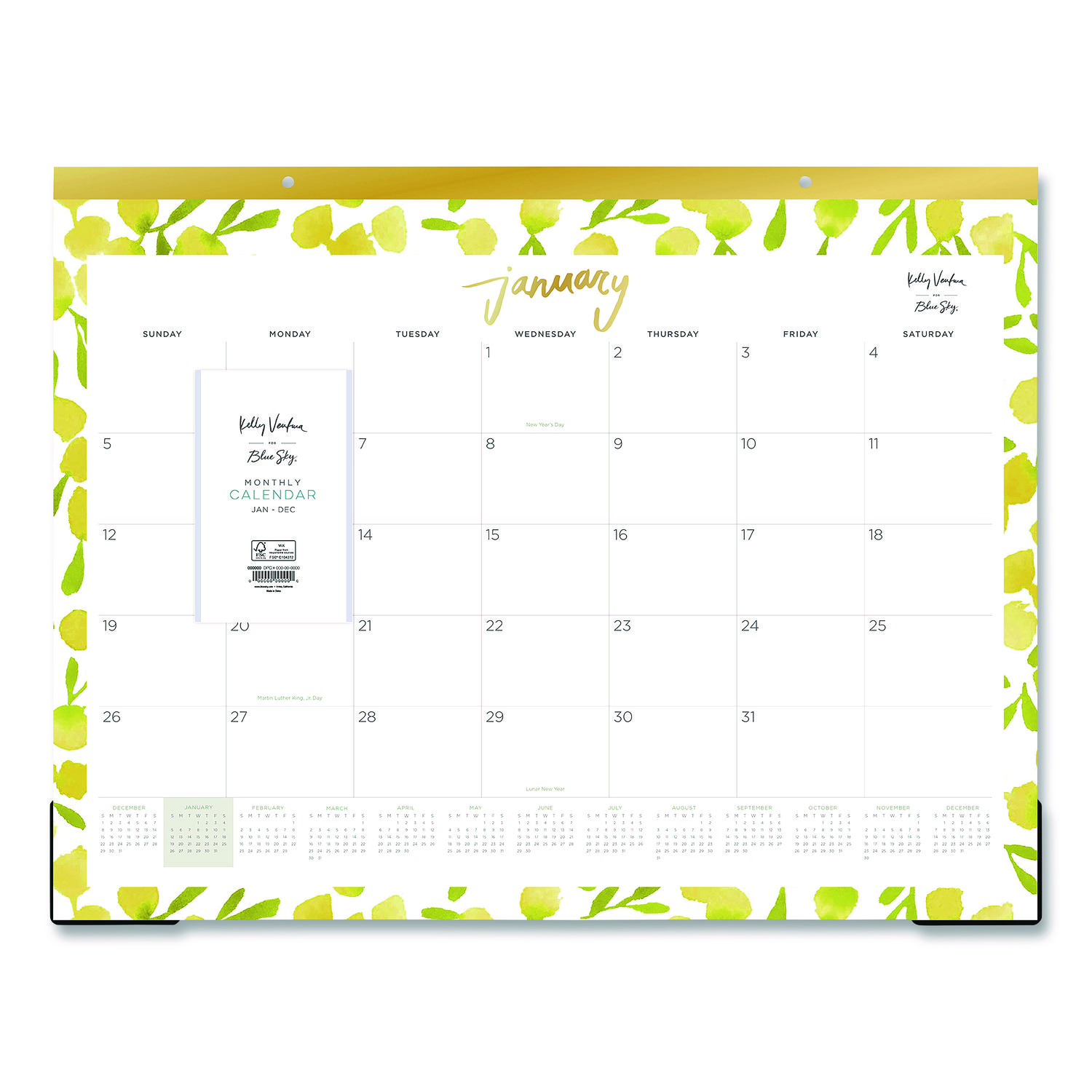 Stay focused and uplifted with this beautiful Kelly Ventura for Blue Sky® desk pad calendar! The fresh abstract lemon artwork by the Michigan artist will keep drawing you back in, making your organization dreams come true. The calendar features generously sized daily blocks for multiple entries and lists all major holidays. A reference calendar with 13 past/future months is included on each page. A sturdy backboard provides a cushioned writing surface as you plan your month out, and clear corner protectors keep pages flat. The paper is premium-quality and acid-free, minimizing potential ink bleed-through. Dated: Yes; Academic Year: No; Calendar Format: Monthly; Calendar Spread Format: One Month per Page.