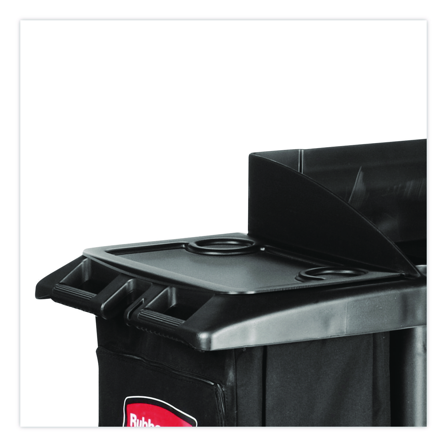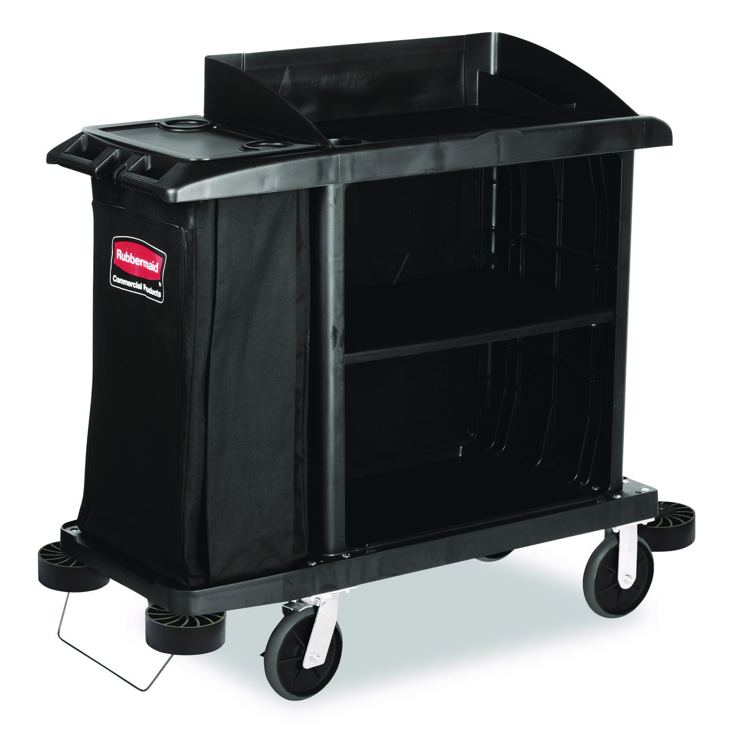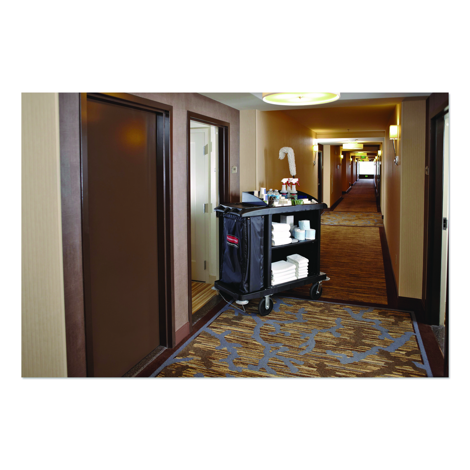 The Rubbermaid Commercial Utility Cart with Zippered Yellow Bag collects waste and transports tools efficiently on 8″ non-marking wheels and 4″ casters. This versatile utility cart has 3 lipped shelves, and a zippered yellow vinyl bag for collecting refuse or launderable items. The surface of the top shelf features tool grips for keeping frequently used items at hand wherever this service cart travels. Material(s): Structural Foam; Overall Material Type: Plastic; Color(s): Black; Color Family: Black.