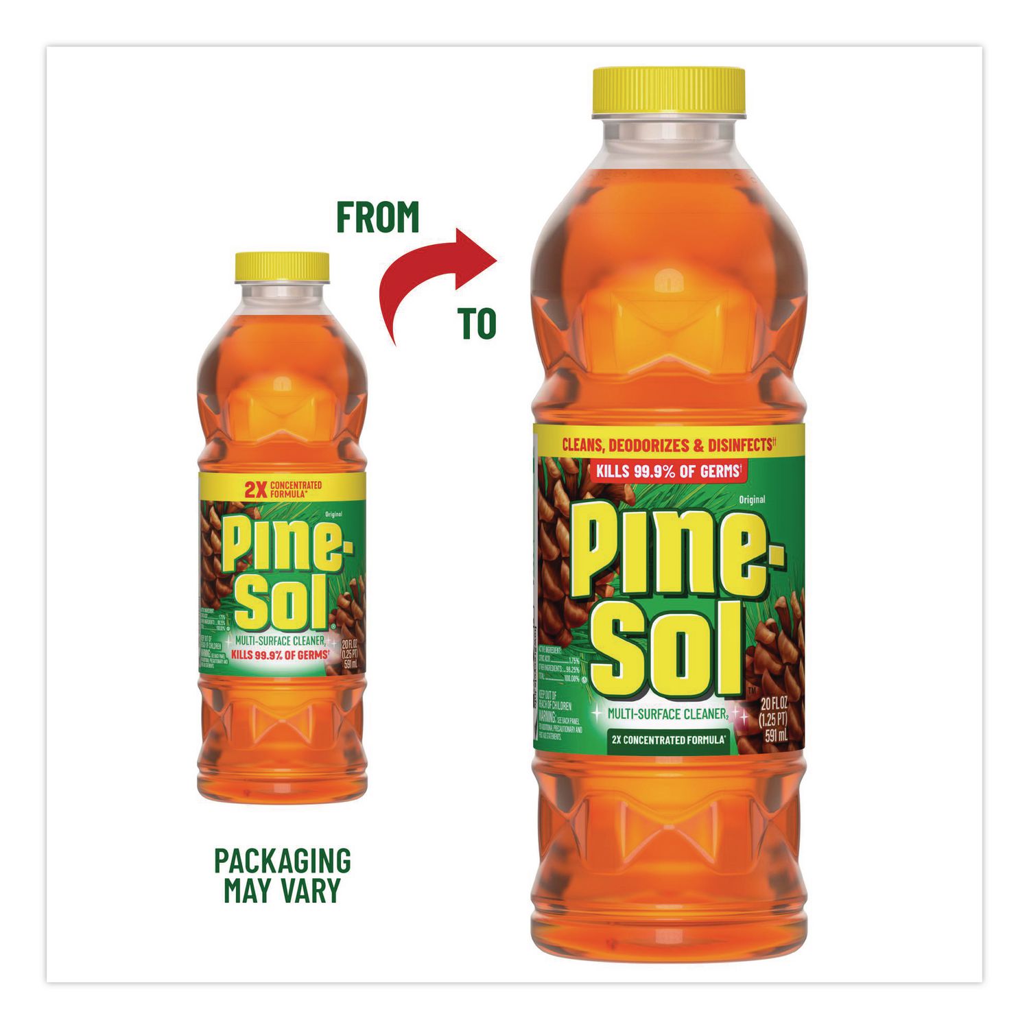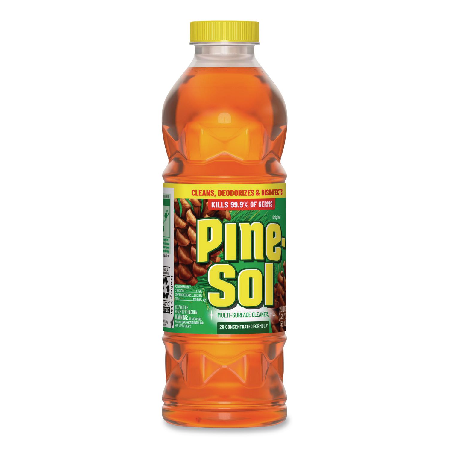 With Pine-Sol® Multi-Surface Cleaner Disinfectant Concentrated, you only need one cleaner to fight tough dirt, grease and grime. Pine-Sol gives you 5x cleaning action as it deodorizes, cuts through grease, removes grime, tackles dirt and removes 99% of allergens, all while leaving a classic pine scent. EPA registered to kill 99% of germs including Influenza A virus and SARS-CoV-2 (cause of COVID-19) when used as directed, on hard nonporous surfaces. This 2x concentrated formula lasts 2x longer than the unconcentrated Pine-Sol® formula. One bottle does it all. Pine-Sol® is suitable for use on sealed wood, tile, stone, porcelain, glass and more when used as directed. Do not use on marble, aluminum, copper or wood that is unfinished, unsealed, unpainted, waxed, oiled or worn. Application: Cleaner/Disinfectant; Applicable Material: Baked Enamel; Bamboo; Cement; Chrome; Concrete; [Engineered] Wood; Glazed Ceramic Tiles; Glazed Porcelain; [Hard] Plastic; Hard Vinyl; Laminate; Linoleum; Metal, Sealed Fiberglass; Sealed Granite; Stainless Steel; Vinyl; Chemical Compound: Active Ingredient: Citric Acid; Dirt Types: Dirt; Grease; Grime.