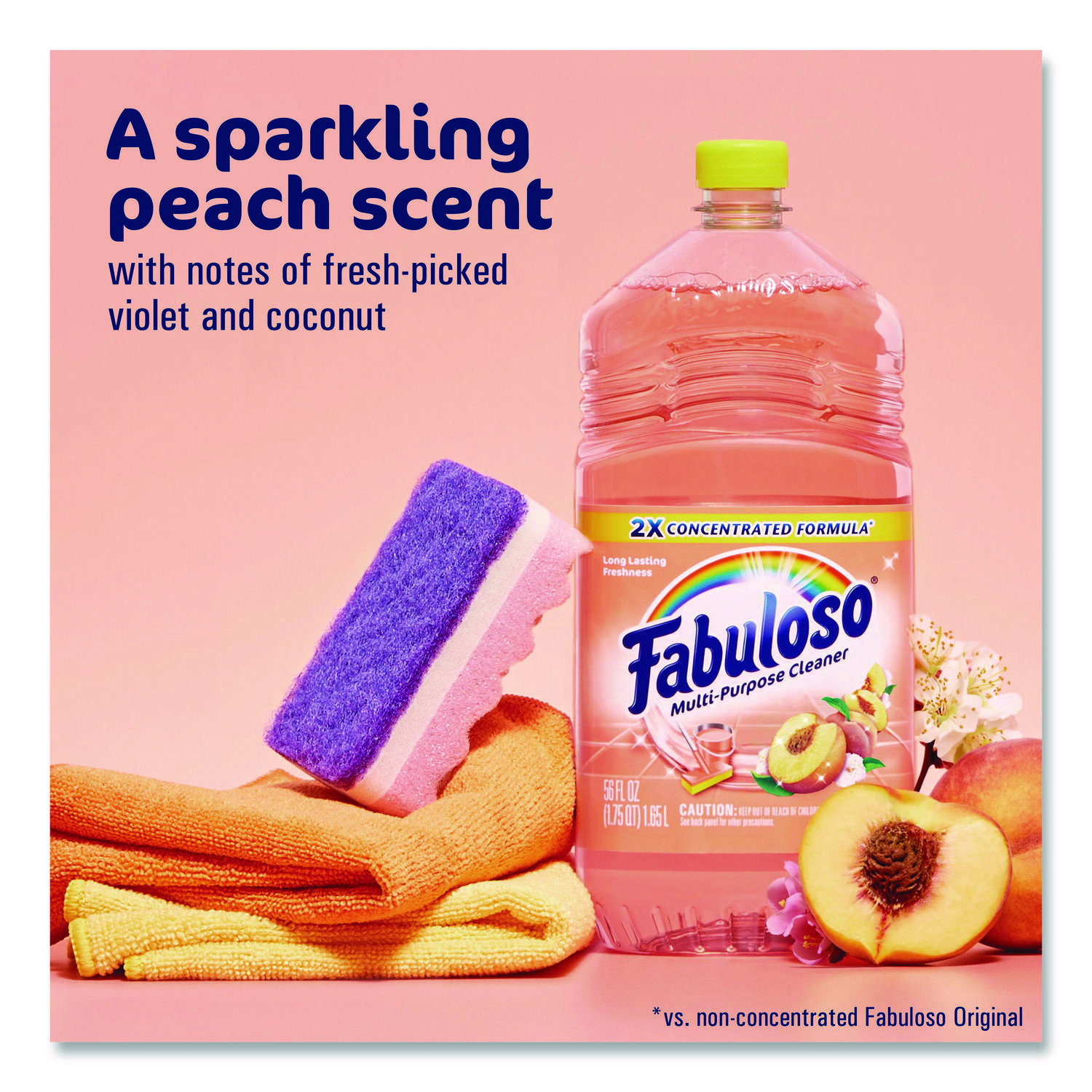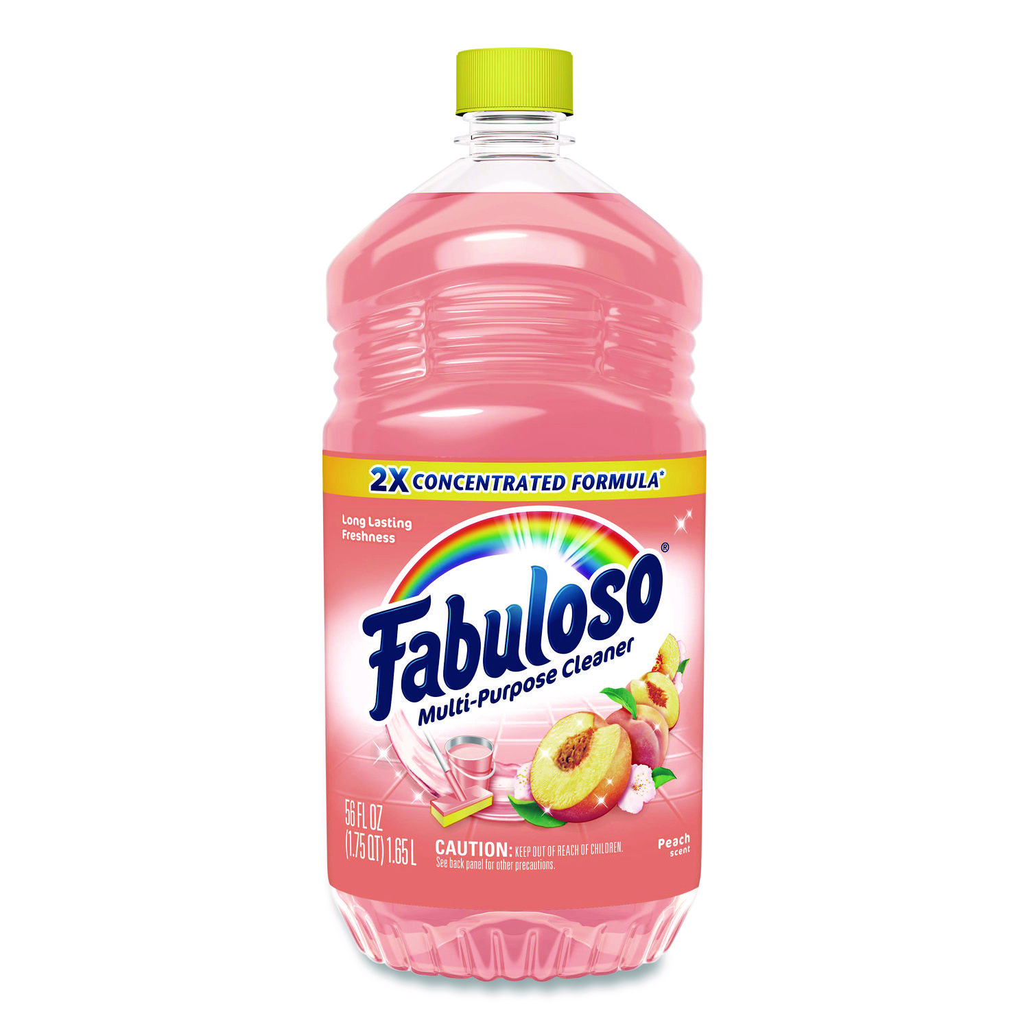 Fabuloso® Multi-Purpose Cleaner, 2X Concentrated Formula transforms your home or business with a fresh scent that lasts. Bring the fragrance of Fabuloso® indoors, and experience a warm, joyful feeling your friends and family will love. Fabuloso® 2X Concentrated Formula now provides 2x more active ingredients compared to non-concentrated Fabuloso Original, giving you 2x the dosage in the same bottle. Every colorful pour from the easy-pour bottle delivers a long-lasting, unmistakable freshness and leaves your home bright and clean. Use Fabuloso® Multi-Purpose Cleaner, on sinks, toilets, tubs, showers, kitchen and bathroom floors, sealed wood surfaces, appliances, counters, windows, mirrors, walls, doorknobs and furniture, and fill every room in your home with joy. Application: All-Purpose; Applicable Material: Granite; Linoleum; Porcelain; Sealed Floors; Stainless Steel; Tile; Vinyl; Dirt Types: Dirt; Grease; Grime; Scent: Peach.