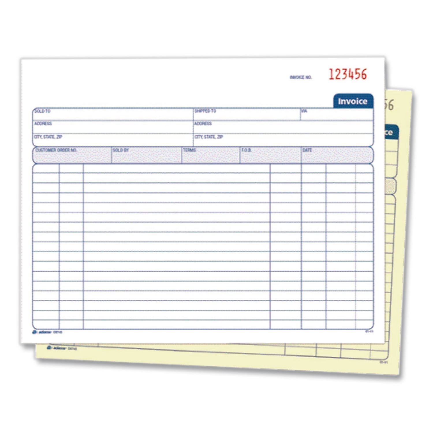 Convenient and versatile, AdamsĀ® Multipart General-Purpose Invoice Forms accommodate a wide range of scenarios. Though preformatted, their layout can be adapted to just about any product or service: retail sales, consultant services, maintenance services and more. Carbonless, multipart format provides you with clean administrative copies, and the wraparound cover allows you to place the front cover between sets as you fill out a form, minimizing the potential for write-through. Each form features space at top for your business’s logo or name stamp. Form Type Details: Invoice/Receipt; Dated: No; Forms Per Page: 1; Form Size: 8.38 x 6.69.
