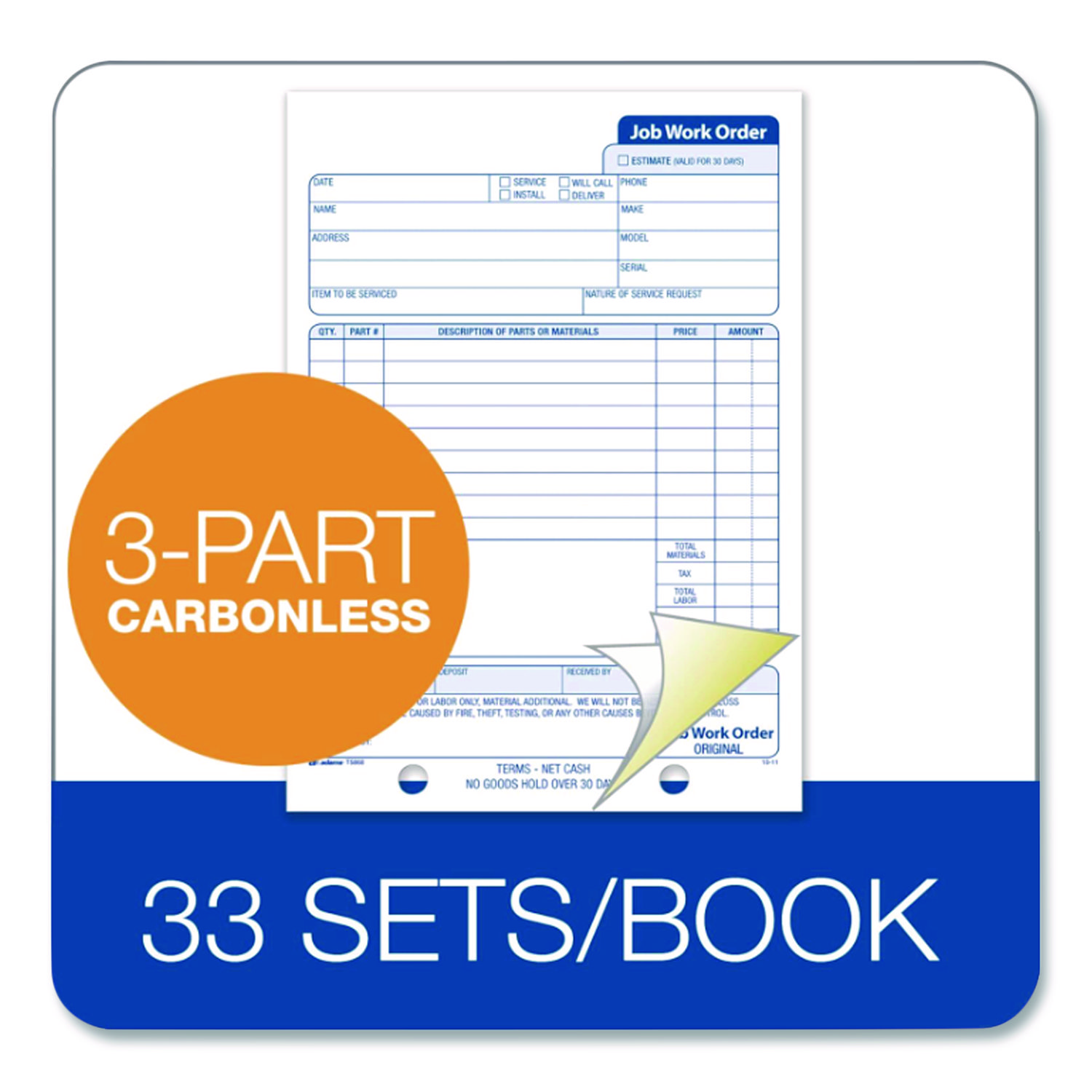 Multipart Job Work Order Pad, Three-Part Carbonless, 5.56 x 7.94, 33 Forms Total