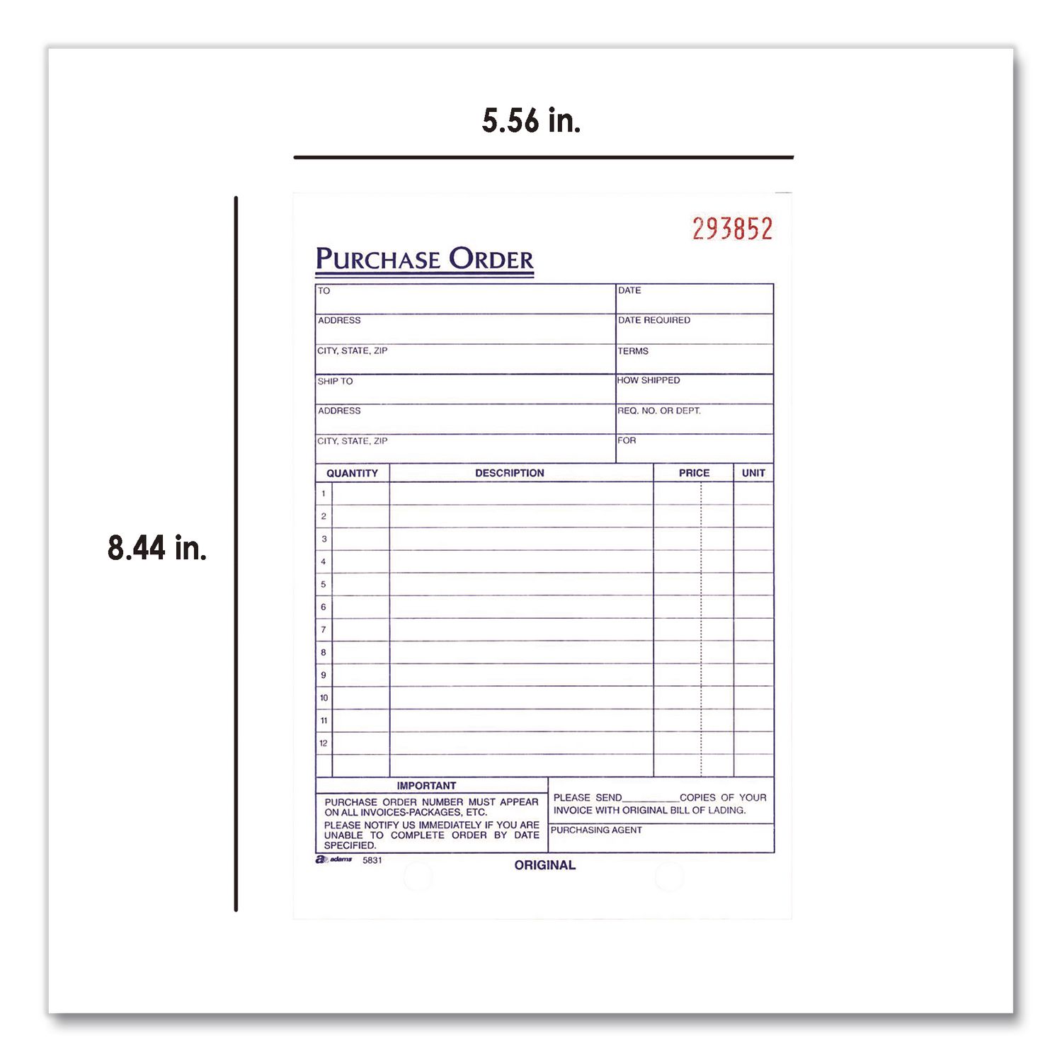 Easily keep hard copy records of each purchase order with the AdamsĀ® Multipart Purchase Order Pad. A comprehensive, preprinted layout features prompts for all the important details. With entry areas for purchaser, ship-to and administrative information as well as itemized order details, just about anything one might wish to capture can be accommodated. Carbonless, multipart format lets you provide a copy to the purchaser while keeping copies for yourself, and the pad’s wraparound cover also allows you to place the front cover between sets as you fill out a form, minimizing the potential for write-through. Form Type Details: Three-Part Carbonless; Dated: No; Forms Per Page: 1; Form Size: 8.44 x 5.56.
