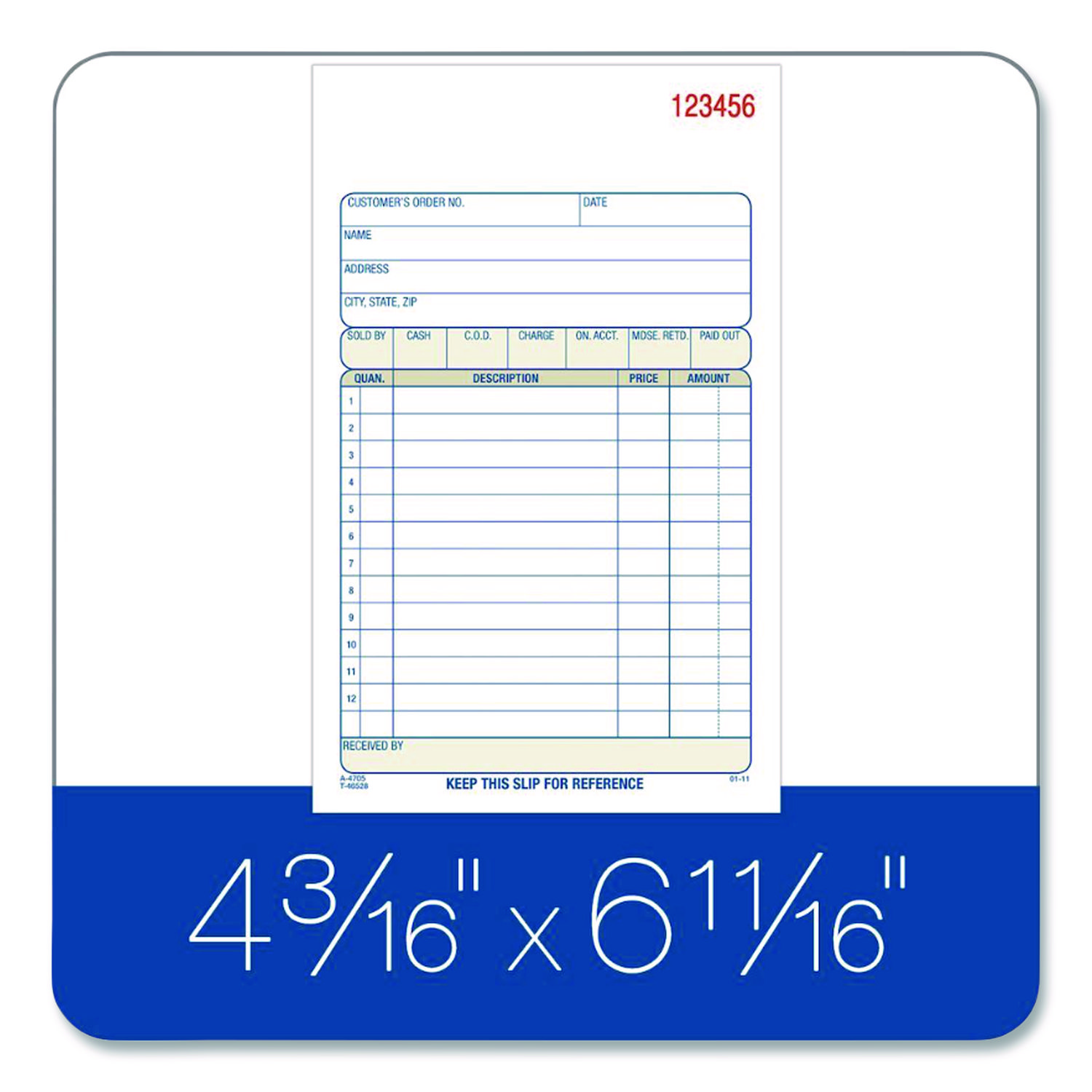 Perfect for keeping hard copy records of your sales, the AdamsĀ® Multipart Sales Order Pad features preprinted layout prompts for all the important details. With entry areas for point of sale, customer, order, terms information and more, anything one might wish to capture can easily be accommodated. Open area at top provides space for your company’s logo, and the order form’s carbonless, multipart format lets you provide a receipt to your customer while keeping clean, administrative copies. The pad’s wraparound cover also allows you to place the front cover between sets as you fill out a form, minimizing the potential for write-through. Form Type Details: Invoice/Receipt; Dated: No; Forms Per Page: 1; Form Size: 4.19 x 6.69.