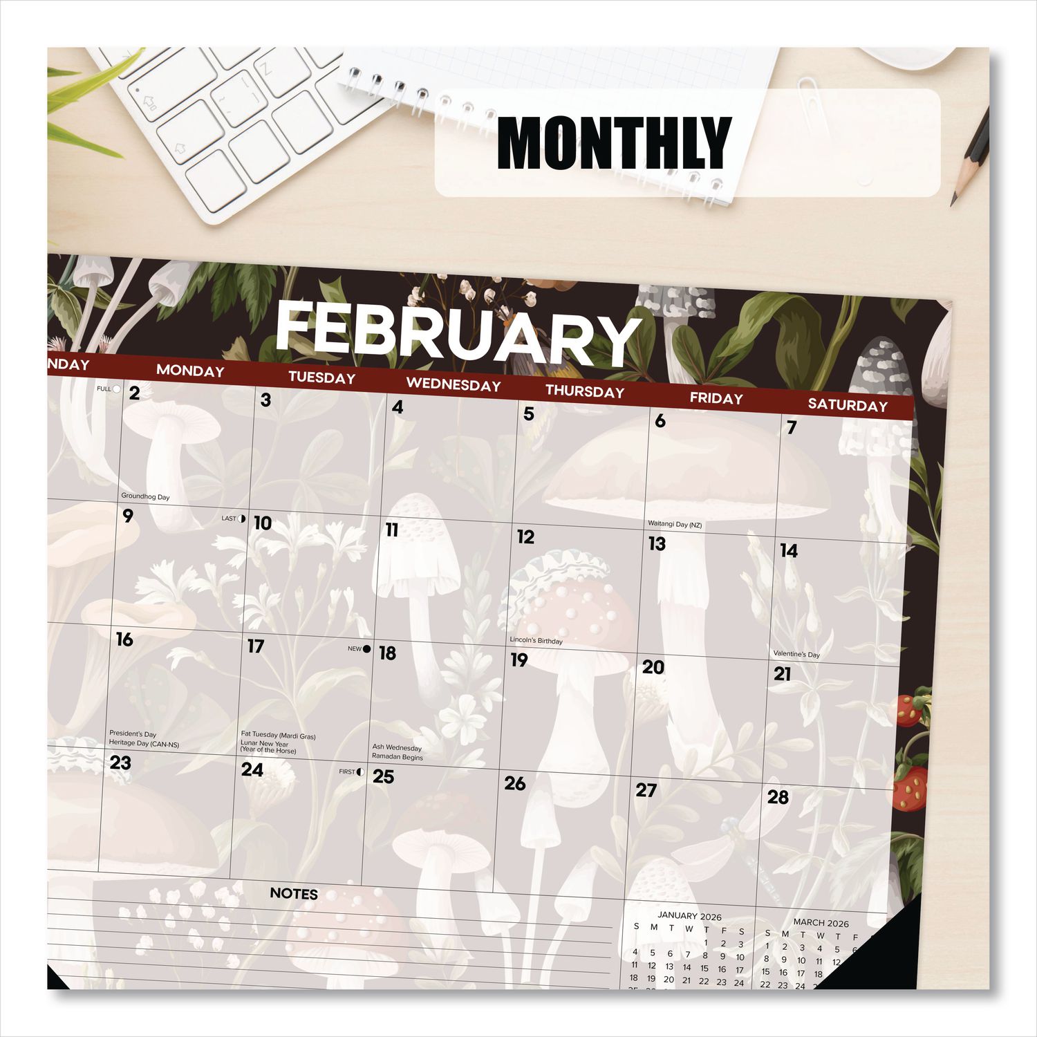Stay organized with a touch of nature in this large desk pad calendar, featuring charming monthly mushroom illustrations and plenty of space for schedules, notes and to-dos. Perfect for jotting down important dates, this calendar is a versatile addition to your workspace. Dated: Yes; Academic Year: No; Calendar Format: Monthly; Calendar Spread Format: One Month Per Page.