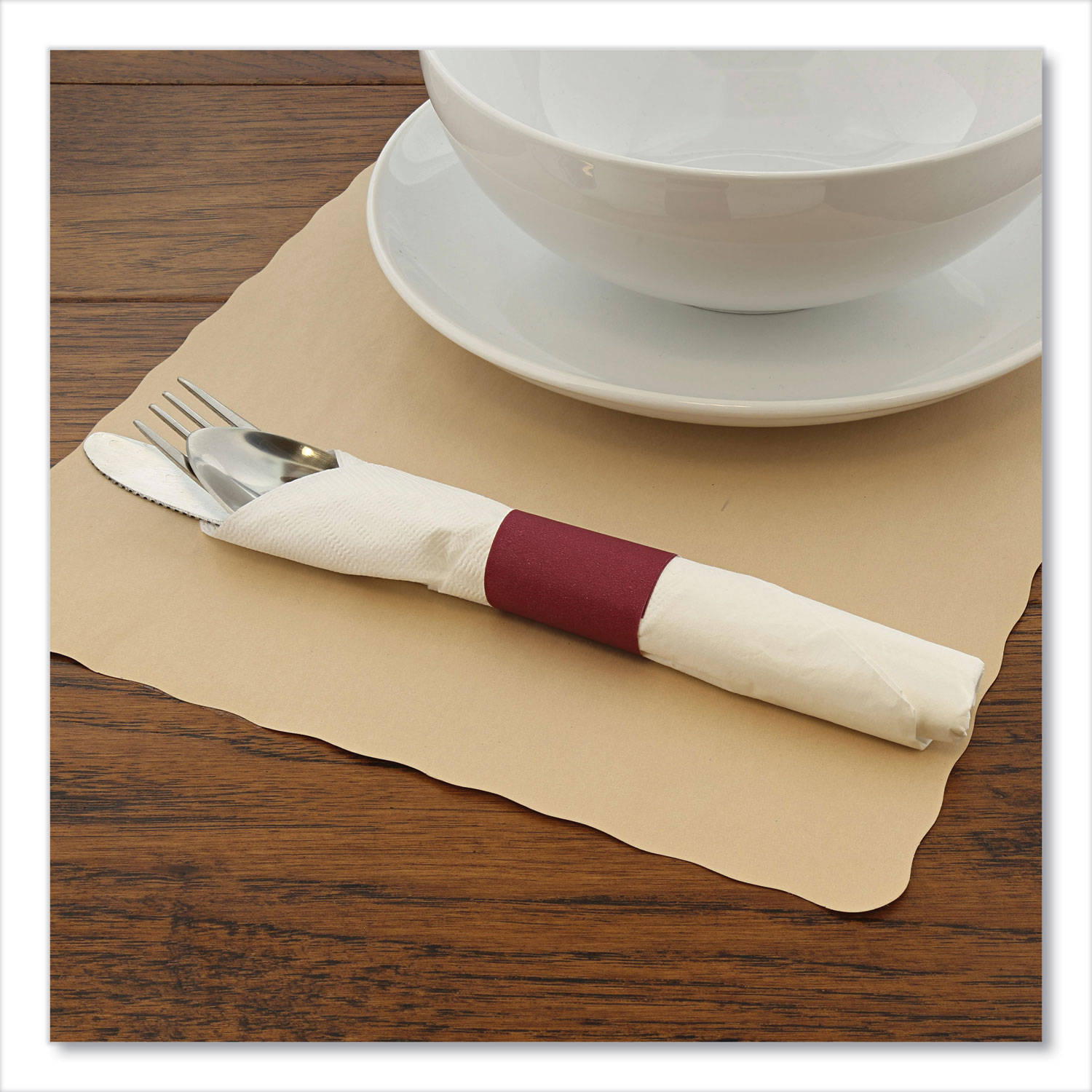 Create a clean, dressed-up appearance using napkin bands to pre-wrap utensils inside napkins. Self-sealing for quick and easy use. Made of high-quality bond paper. Material(s): Paper; Color(s): Burgundy; Width: 1.5″; Depth: 4.25″.