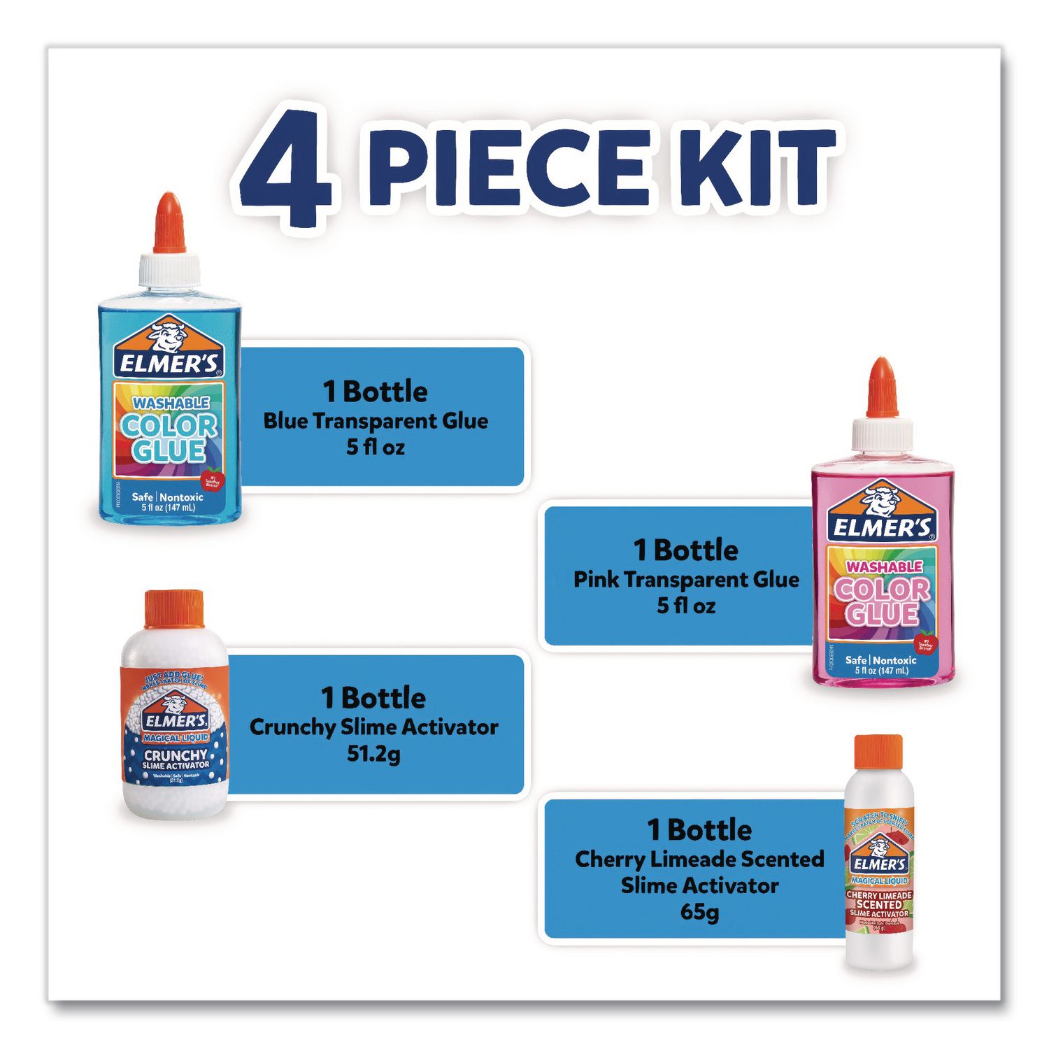 This all-inclusive kit includes every ingredient you need to make cool, vibrant slime. You’ll get one bottle each of blue and pink transparent color glue, which add a blast of color to your slime. You’ll also receive a bottle each of Elmer’s Magical Liquid Crunchy Slime Activator and Cherry Limeade Scented Slime Activator. Elmer’s Magical Liquid is an all-in-one formula that turns Elmer’s Glues into slime! Adhesive Type: Liquid; Product Packaging: Bottle; Washable/Removable: Yes; Color on Application: Blue Glitter; Teal Metallic; Yellow Glow in the Dark.