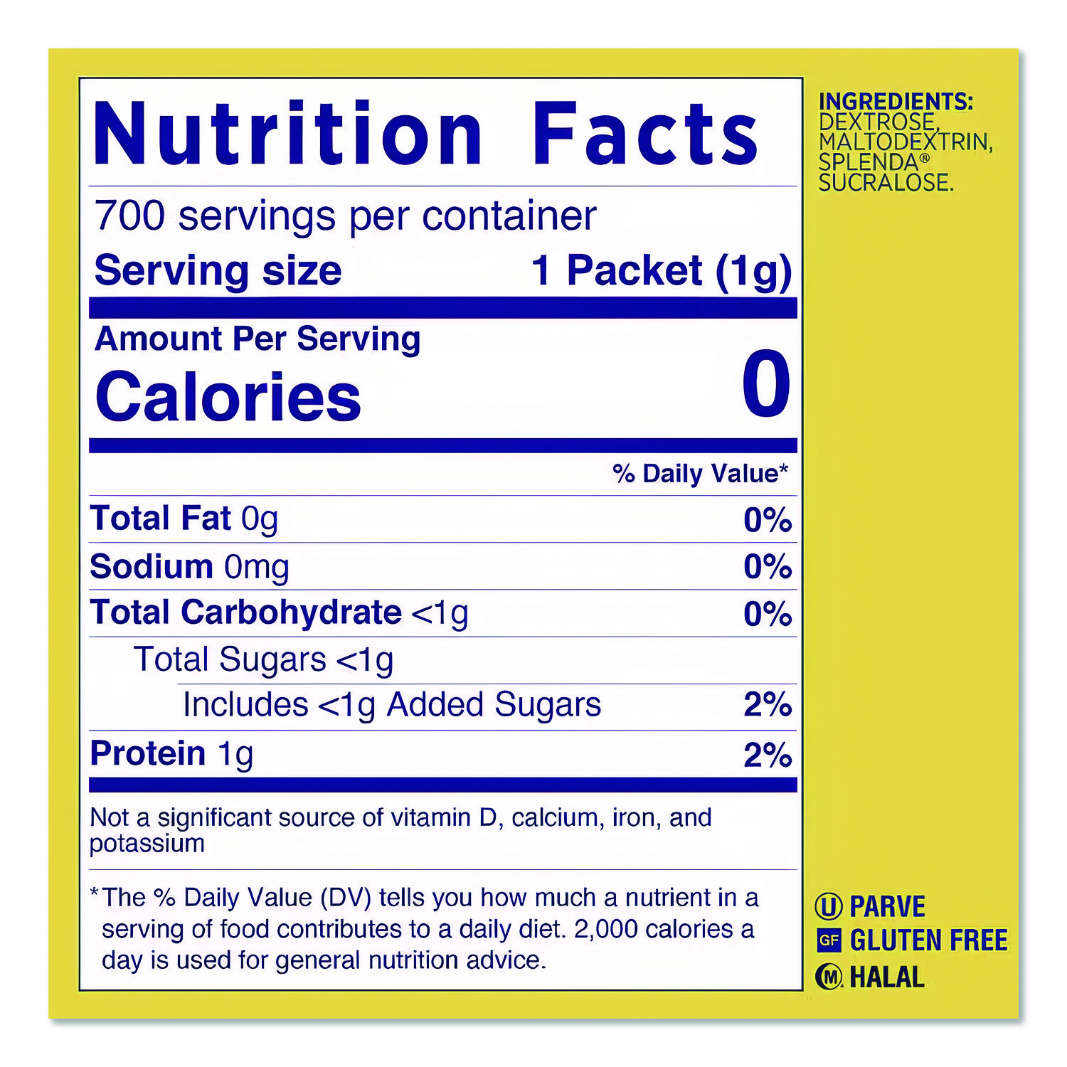 Splenda Sweetener tastes like sugar with zero calories. It is the perfect zero calorie sugar alternative for sweetening your coffee, tea, other beverages, oatmeal, fruit, and more! The Splenda brand is the number one recommended sweetener brand by doctors and dietitians, plus it’s America’s favorite sweetener brand. Try Splenda sweeteners today and taste the difference! Product Packaging: Packet; Premeasured: Yes; Sugar Free: Yes; Gluten Free: Yes.