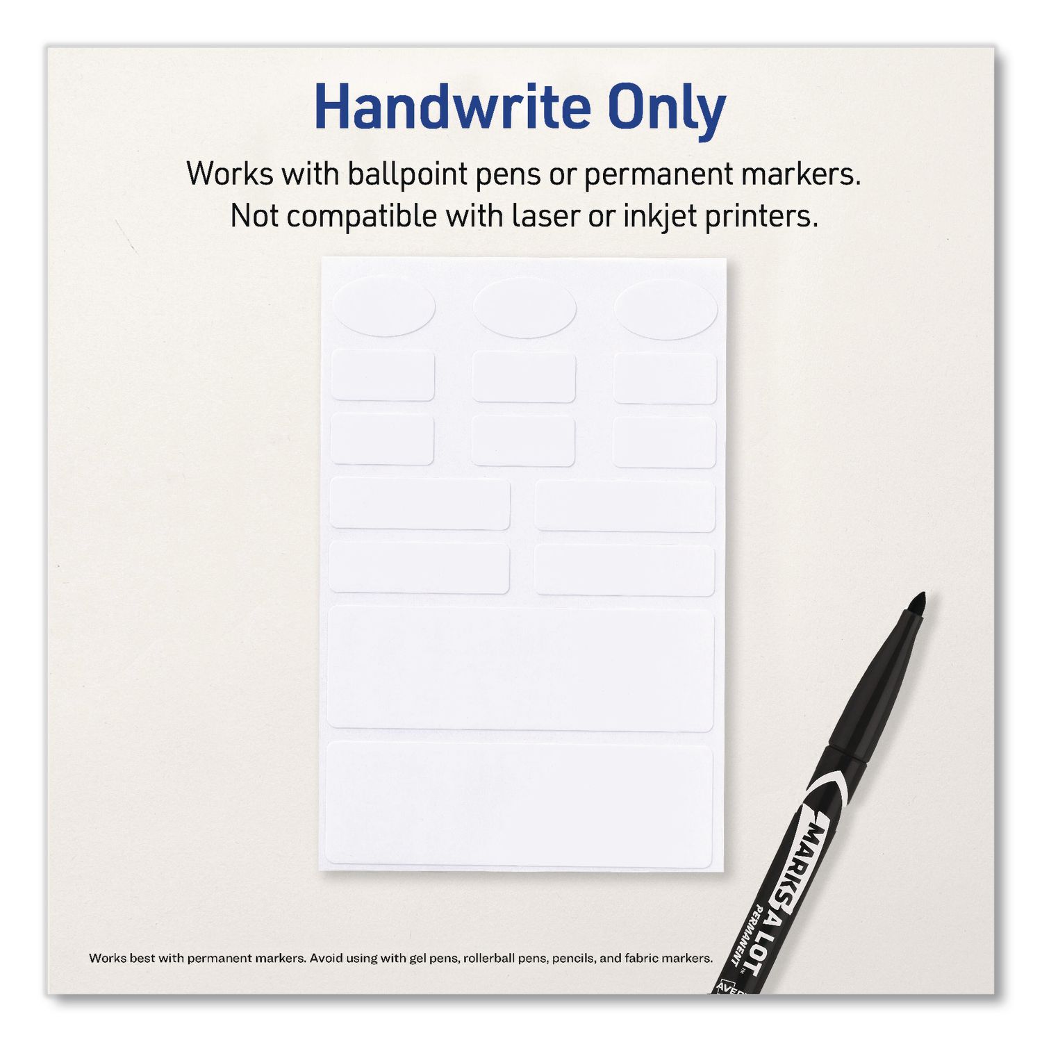 Be the first to review “No-Iron Fabric Labels, Handwrite Only, Assorted Shapes and Sizes, White, 15/Sheet, 10 Sheets/Pack”