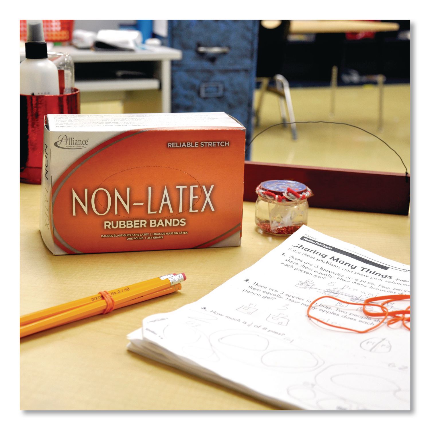Non-latex rubber bands are made from synthetic rubber and are recommended for home, school, workplace, government and medical facilities. Approximate Band Count: 125; Band Trade Size: Assorted; Band Color: Orange; Band Material: Synthetic Rubber.