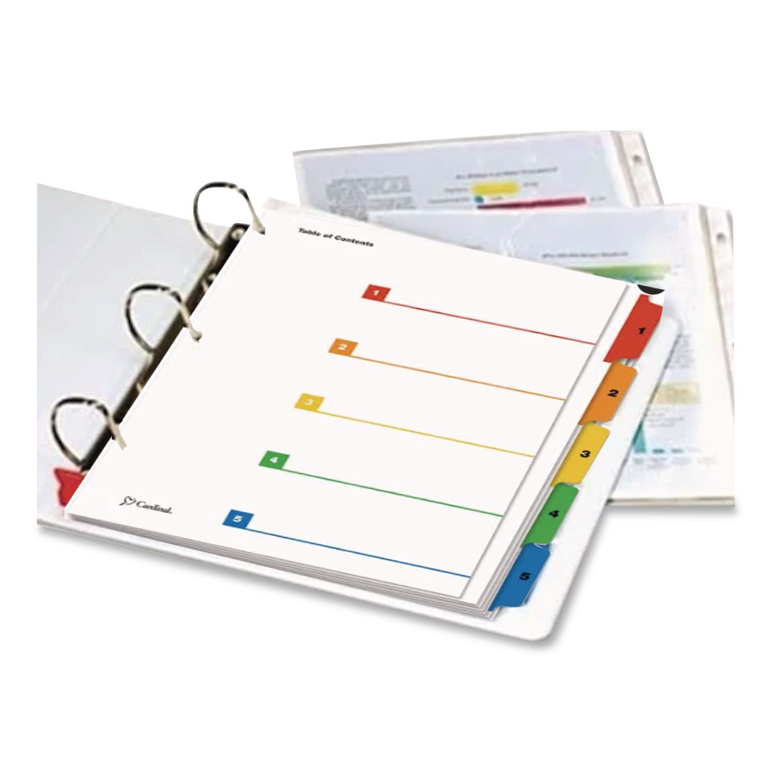 Cardinal® OneStep® Table of Contents Dividers help you create an index system instantly. Matching, preprinted tabs on the divider sheets can be used in either vertical or landscape formats. Tab sets have coordinating Table of Content sheets. Easy to use, free templates in your favorite software are available online; details on packaging. Tabs and ring edges are reinforced to withstand heavy use. Laser and inkjet compatible. Three-hole punched and sized for 8.5″ x 11″ sheets. Index Divider Style: Arabic Numeric; Index Divider Size: 11 x 8.5; Punched/Unpunched: 3-Hole Punched; For Use With: Ring Binders.