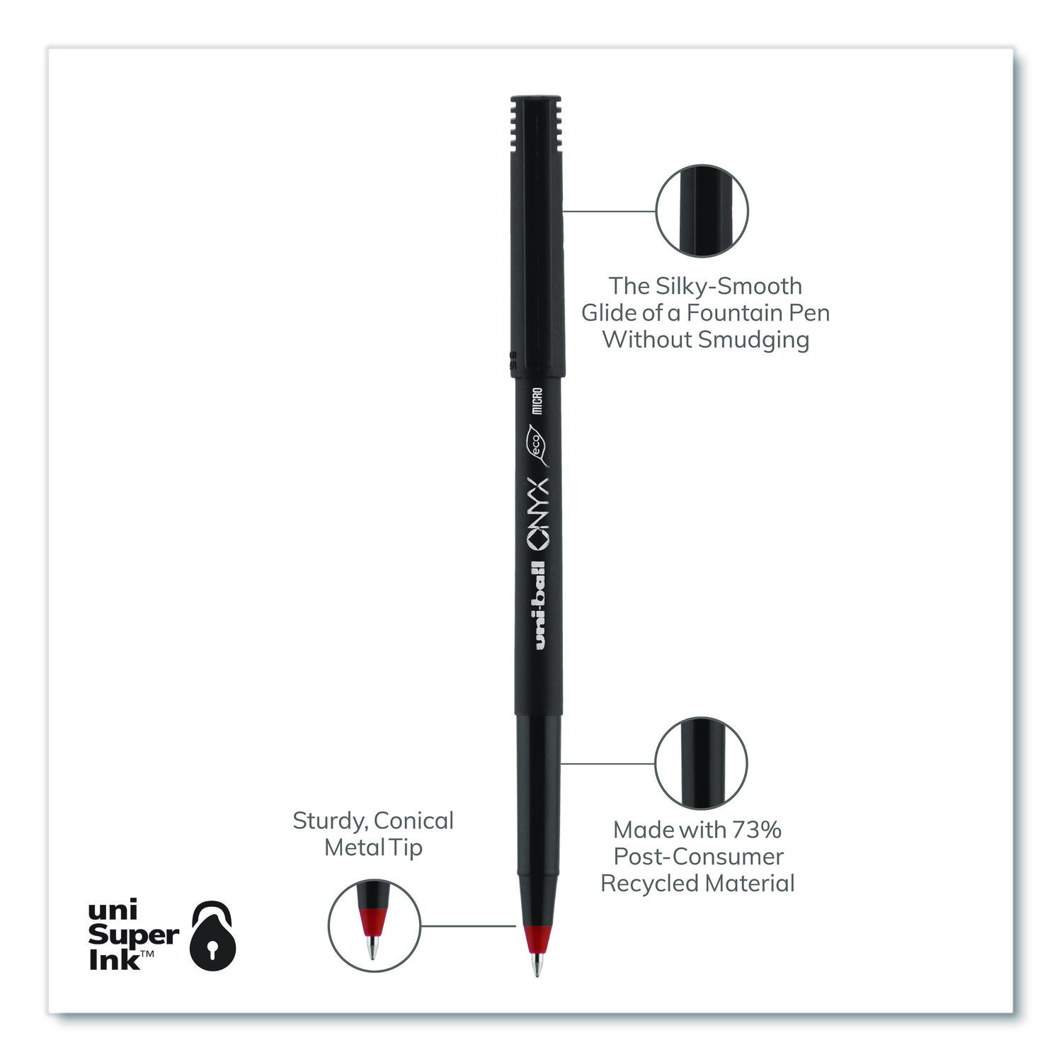 Stock your office, home or classroom with Onyx Rollerball Stick Pens from uni-ball featuring strong, long lasting tip sizes. This rollerball pen delivers the silky-smooth glide of a fountain pen without smudging for effortless writing. ONYX pens produce crisp and precise lines for intricate writing, making it easy to create super fine details in your drawings and diagrams. Capped roller pens are useful for a variety of tasks from note taking to signing checks and legal documents to uniquely embellishing fun and creative writing projects. Innovative uni Super Ink technology forms a strong bond with the paper, protecting from water, fading and fraud. A great economic and environmentally-conscious choice as this super sleek micro point roller pen is made from post-consumer recycled material. Pen Sub-Brand & Product Family: ONYX®; Pen Type: Rollerball Pen; Pen Style: Stick; Pen Tip Type: Conical.