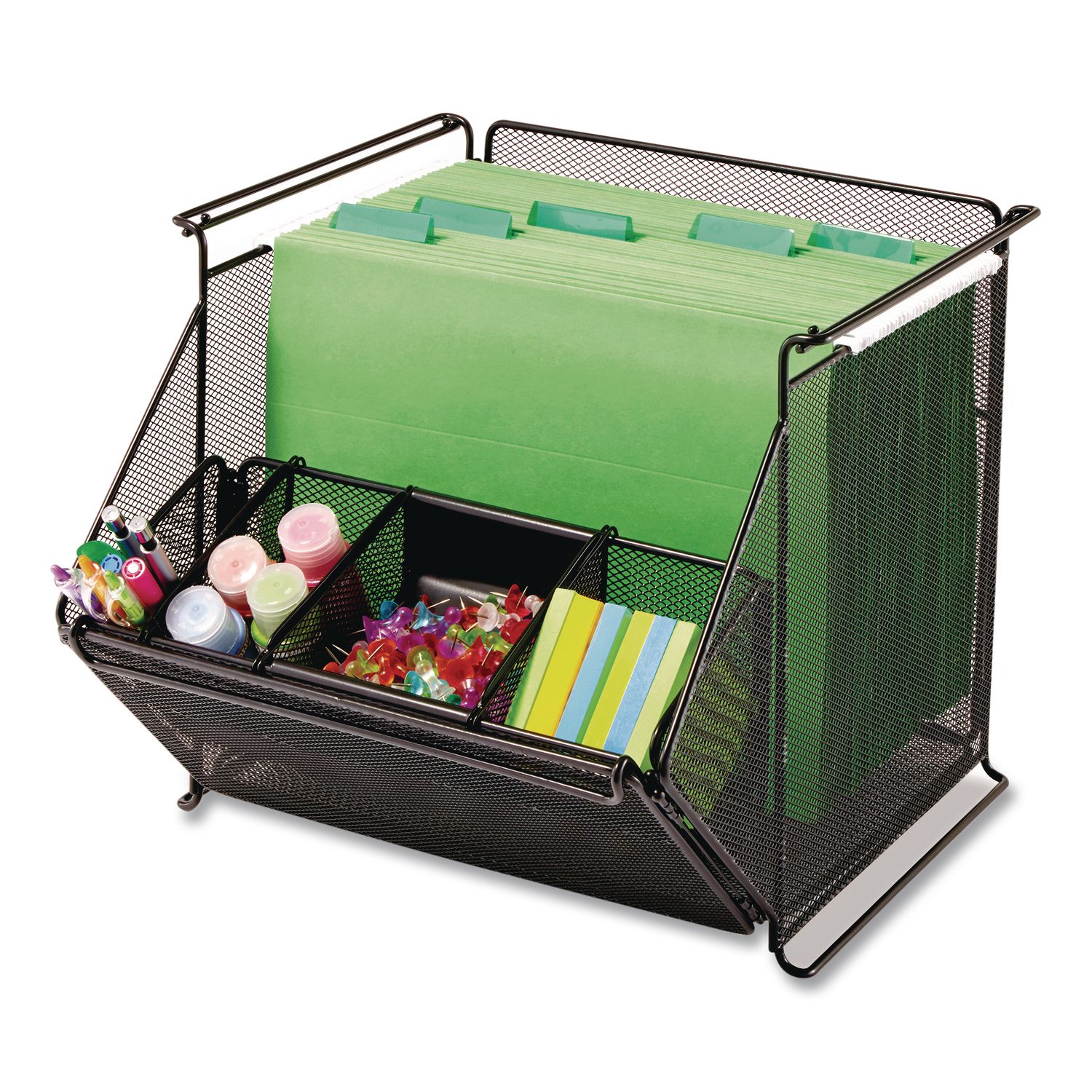 Sturdy, stackable mesh bin accommodates storage needs from office supplies to letter-size hanging file folders and everything in between. Stacks up to two high to optimize space. Detachable accessory organizer can mount on the front or the back and allows even the smallest supplies to be kept neat and within easy reach. Organizer includes two dividers and one divider tray. Desktop Supplies Organizer Type: Multipurpose; Number of Compartments: 4; Overall Width: 14″; Overall Depth: 15.5″.