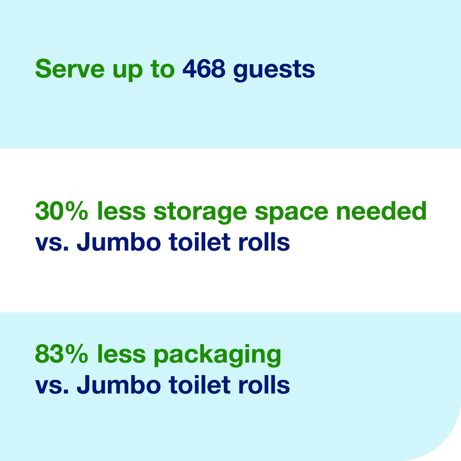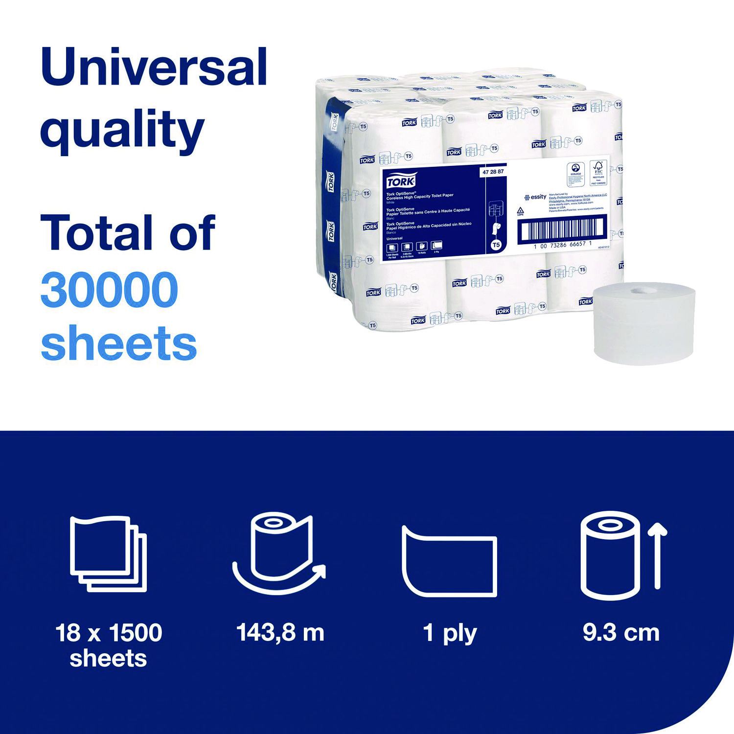 Tork OptiServe® Coreless is a high-capacity coreless toilet paper system for facilities where efficiency, sustainability and providing a great experience are key. These high-capacity toilet paper rolls serve 468 guests when used with a four-roll dispenser, reducing bath tissue run-outs and saving staff time on refilling dispensers. Coreless toilet paper reduces waste, as there are no cores or wraps, and these high-capacity rolls have 83% less packaging compared to jumbo rolls. Plus, these tubeless toilet paper rolls need 30% less storage than jumbo rolls and they come in Tork® Easy Handling packaging to make carrying them easier. Tissue Type: Toilet; Number of Plies: 2; Number of Sheets: 1,500/Roll; Width: 3.66″.