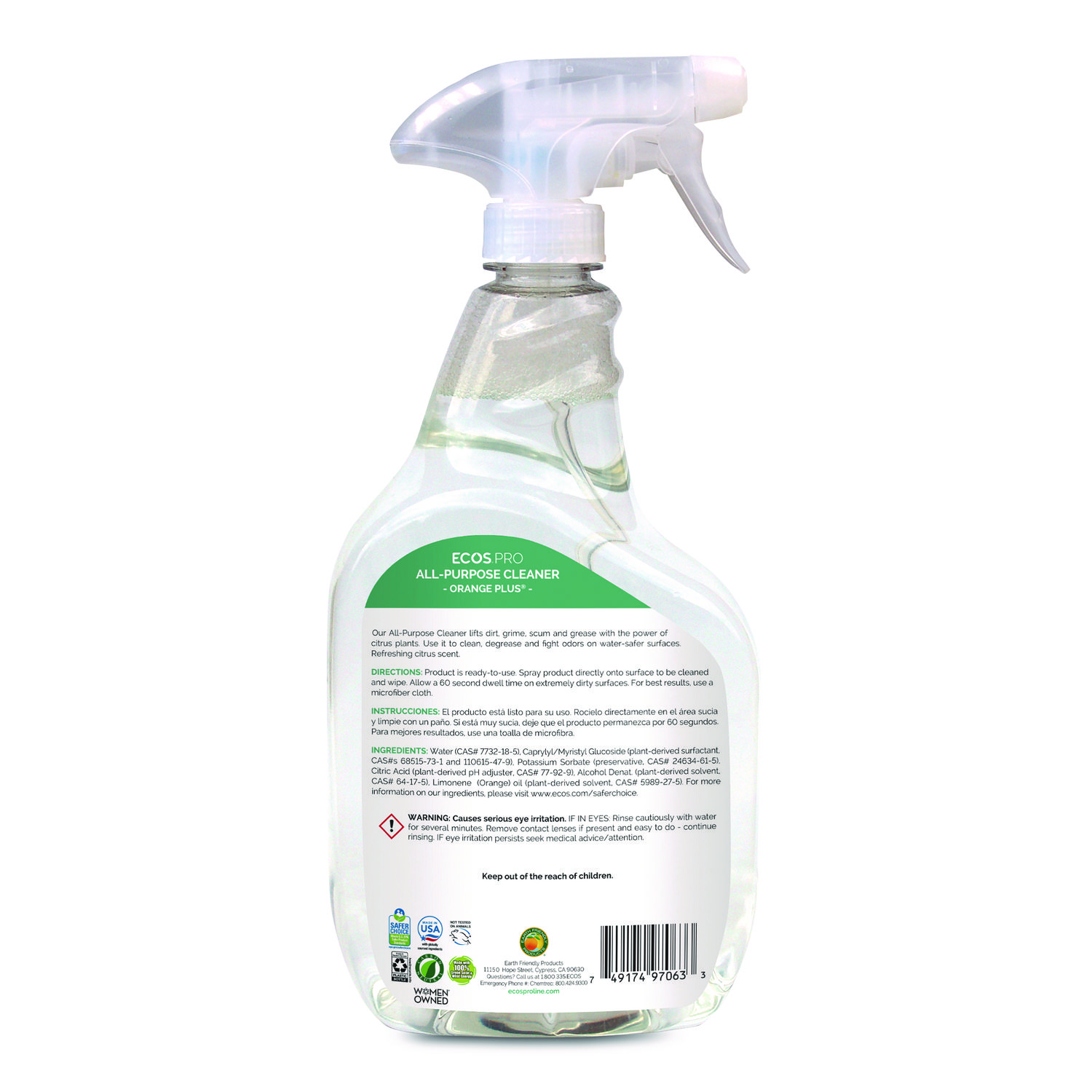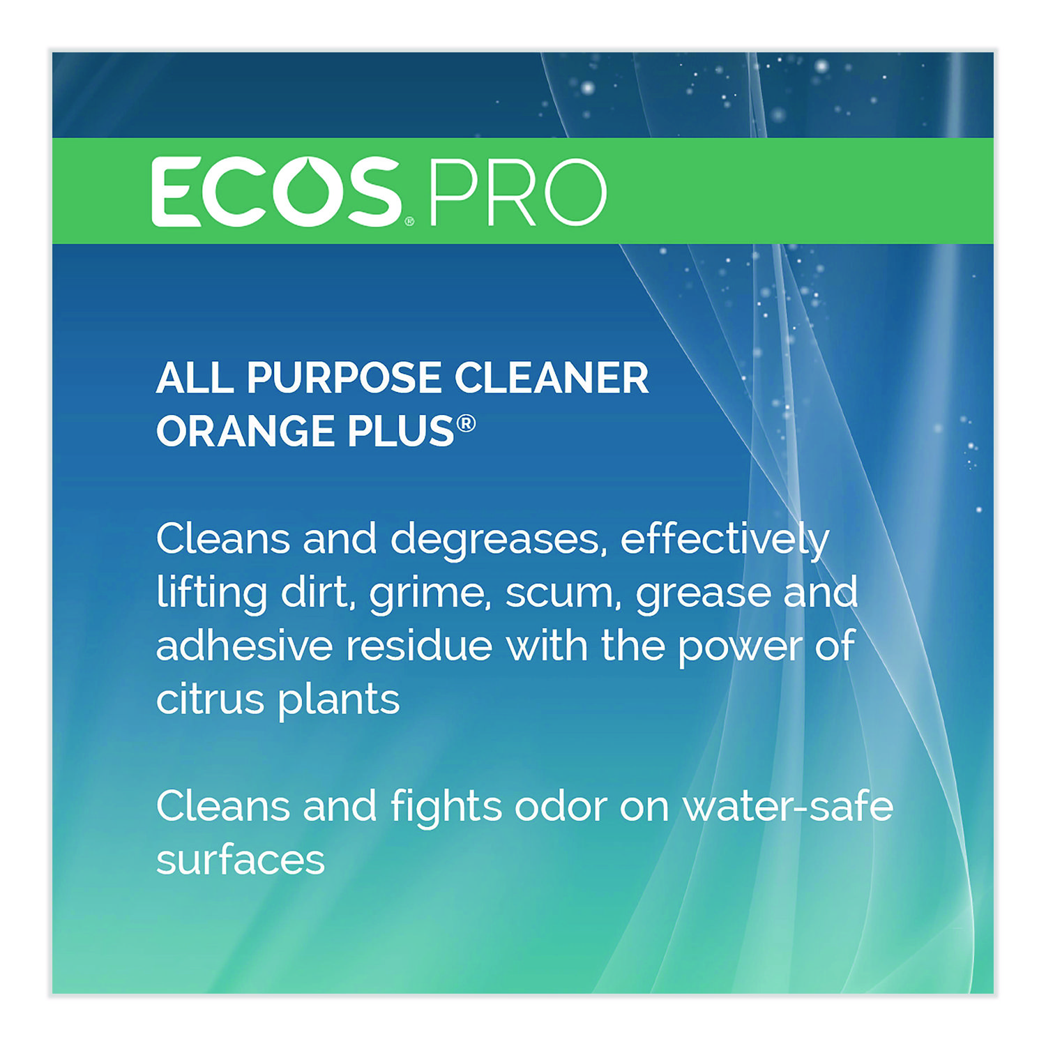 ECOS PRO Orange Plus is an all-purpose cleaner and degreaser that effectively lifts dirt, grime, scum, grease and adhesive residue with the power of citrus plants. Use it to clean and fight odors on water-safe surfaces. This formula is made using sustainable, plant-powered ingredients. Made without dyes; gray water and septic safe. Features a refreshing citrus scent. Not tested on animals. Manufactured in a facility that is LEED Zero Carbon, LEED Zero Waste and LEED Zero Energy Certified. Application: Degreaser/Cleaner; Applicable Material: Water-Safe Hard Surfaces; Chemical Compound: Citric Acid; Dirt Types: Adhesive Residue; Dirt; Grease; Grime; Scum.