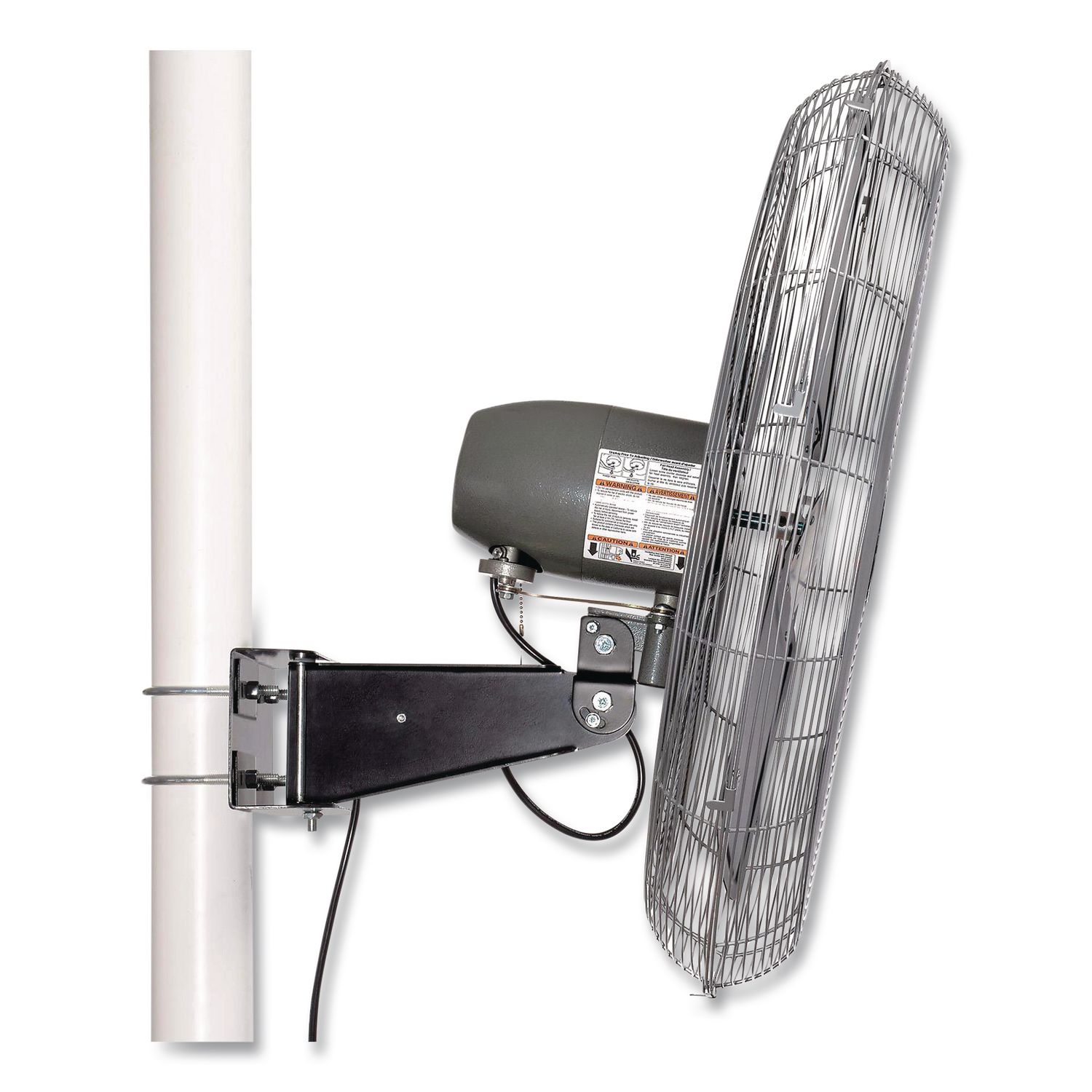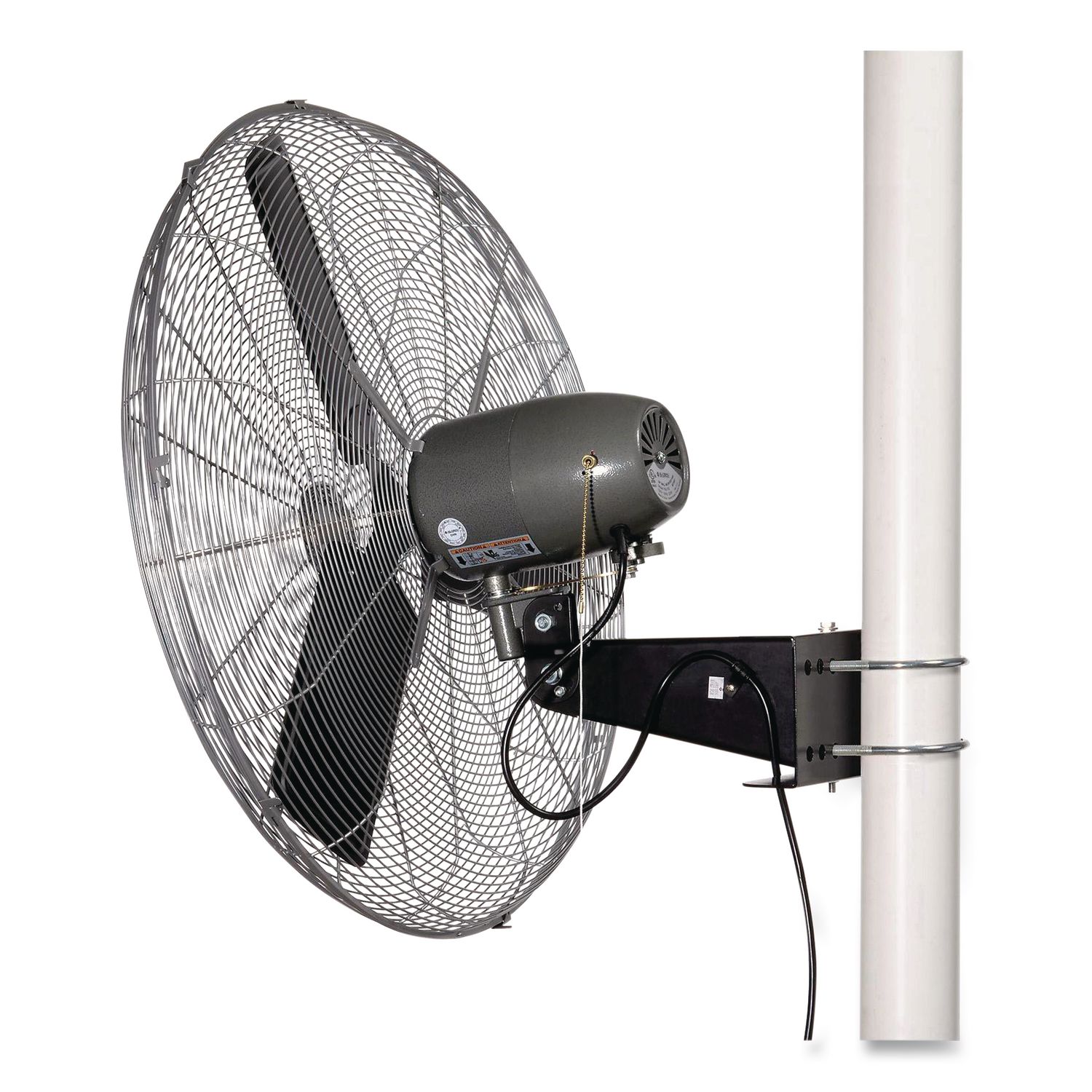 Provides refreshing air flow without taking up valuable floor space in any setting like loading docks, offices, schools, offices and kitchens. This fan easily attaches to columns or poles with included mounting bracket. It has an efficient three-speed open-air over PSC-type ball bearing motor that is permanently lubricated. Quiet metal fan blades are balanced for optimum air distribution and enclosed in steel wire guards for safety with a safety-clutch oscillating mechanism that prevents jamming. A simple push button gives you the option to keep the head fixed in one direction or 70° oscillating operation with the ability to tilt it for perfect air-flow placement. Pull chain on/off. Fan Head Size: 30″; Fan Type: Industrial; Oscillates: Yes; Color(s): Black.