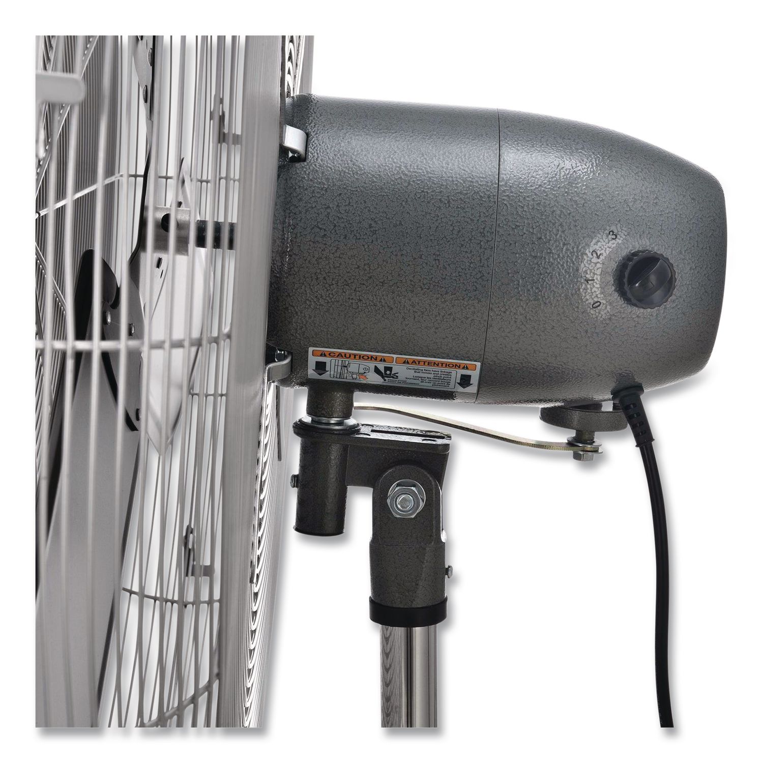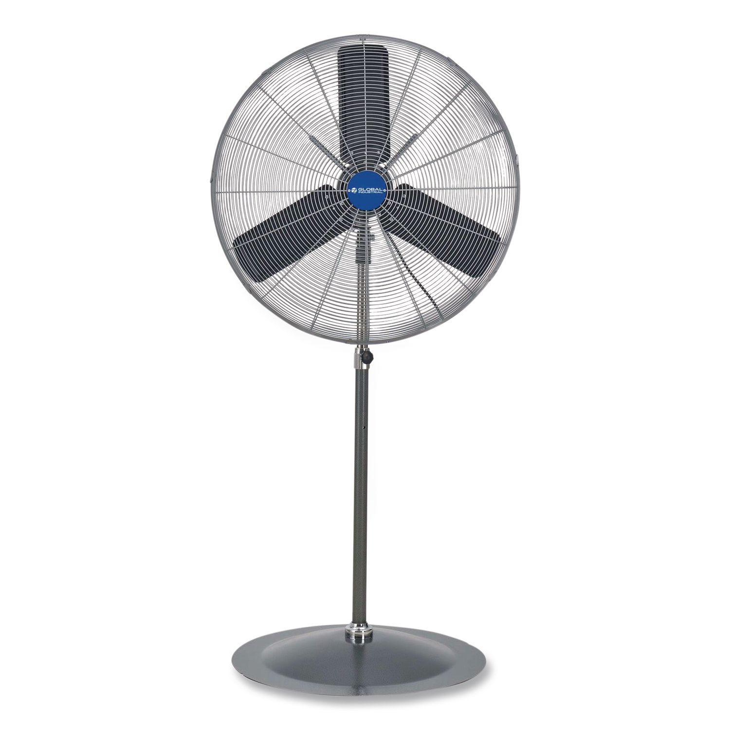 Provides refreshing air exactly where it’s needed in any setting including loading docks, offices, schools, exercise studios and kitchens. It has an efficient three-speed open-air over PSC-type ball bearing motor and three aluminum fan blades for optimum air distribution that are enclosed in steel wire guards for safety. A simple push button gives you the option to keep the head stationary or oscillate in an 80° arc, with the ability to raise and lower the fan head from 58″ to 65″on the pedestal and tilt the head for precise air-flow placement. Fan Head Size: 30″; Fan Type: Industrial; Oscillates: Yes; Color(s): Gray.