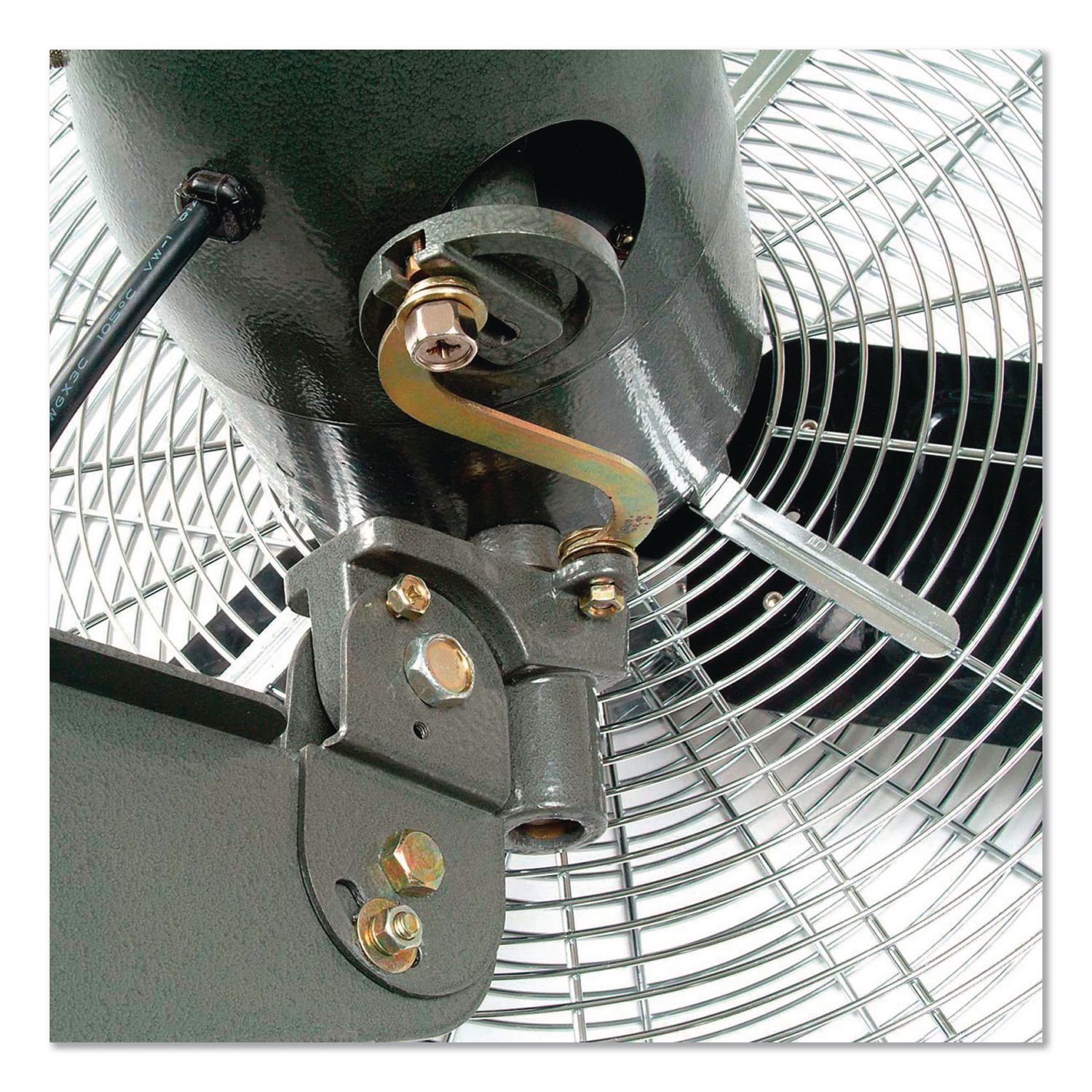 Provides refreshing air flow without taking up valuable floor space in any setting like loading docks, offices, schools, offices and kitchens. It has an efficient three-speed open-air over PSC-type ball bearing motor that is permanently lubricated and quiet metal fan blades that are balanced for optimum air distribution and enclosed in steel wire guards for safety with a safety-clutch oscillating mechanism that prevents jamming. A simple push button gives you the option to keep the head fixed in one direction or to tilt it for perfect air-flow placement. Pull chain on/off. Fan Head Size: 24″; Fan Type: Industrial; Oscillates: Yes; Color(s): Black.