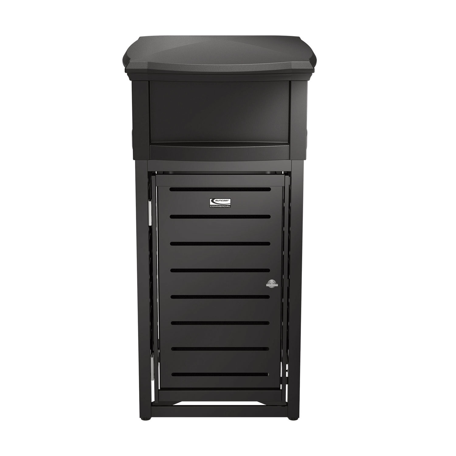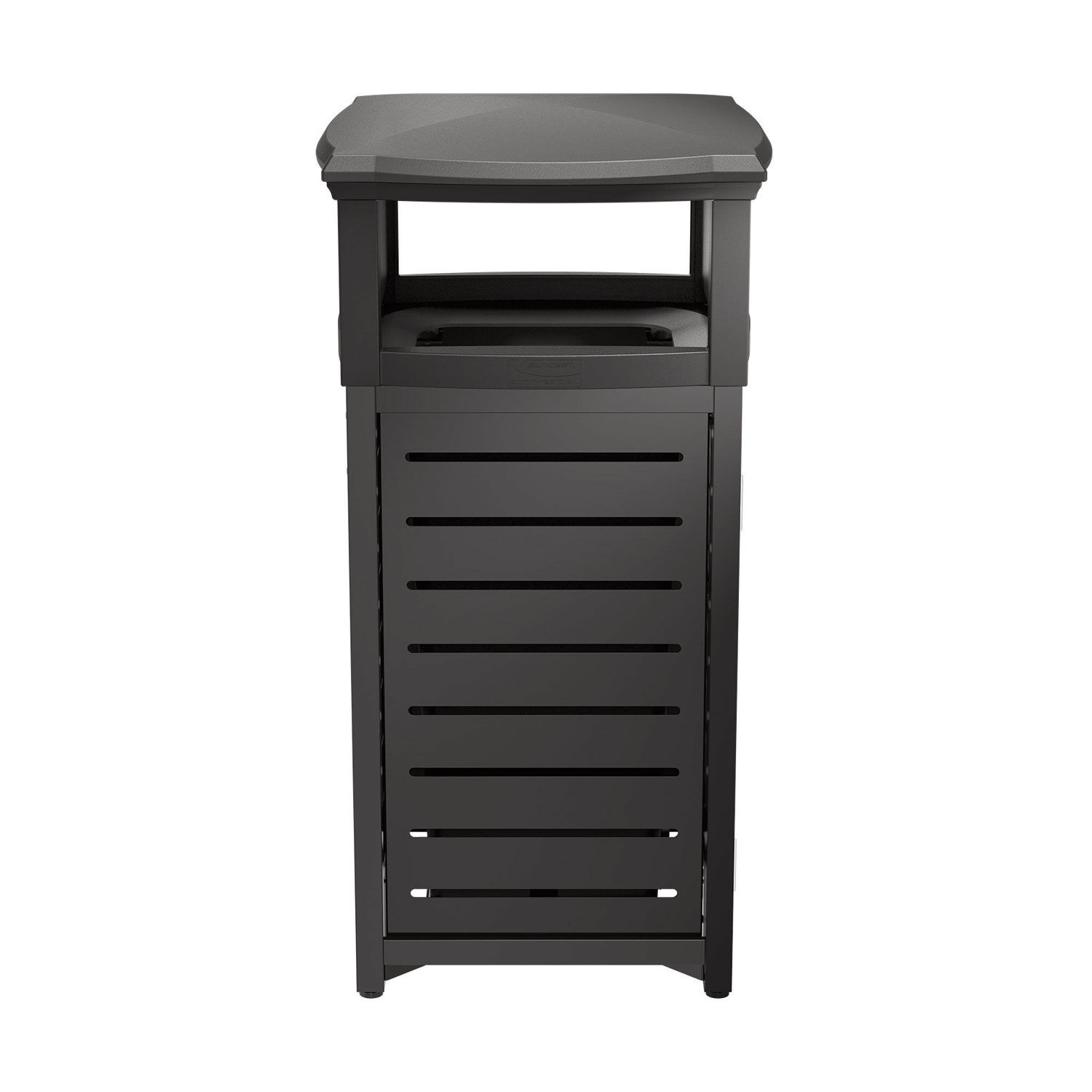 This outdoor decorative square trash can is the perfect additional to any store front or outdoor space. This can is constructed with a durable thermoplastic coated frame and slatted panels that are made to withstand the elements of the outdoors. There is a latching access door that allows you to remove the liner for easy bag placement. The adjustable feet make it simple to level the trash can on uneven surfaces. This can includes a stylish resin lid with UV inhibitors to help maintain the color over the life of the product. This product will enhance the look of any business or storefront. Flat top, two side openings. Waste Receptacle Type: Outdoor All-Purpose Waste Bin; Material(s): Metal; Application: Outdoor All-Purpose Waste Disposal; Interior Volume Capacity: 29 gal.