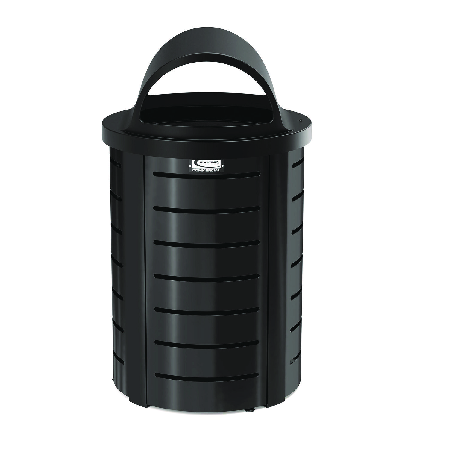 The Suncast Commercial metal trash can features a durable roto-molded lid to keep trash covered and out of sight. The thermoplastic-coated metal frame resists fading, cracking or discoloring, especially sitting out in the sun and different weather conditions. The removable plastic liner provides an easy clean out, while the adjustable leveling foot pads keep the can stable on the ground. This can will look great in stadiums, campuses and other high traffic outdoor areas. Waste Receptacle Type: Outdoor All-Purpose Waste Bin; Material(s): Metal; Application: Outdoor All-Purpose Waste Disposal; Interior Volume Capacity: 35.38 gal.