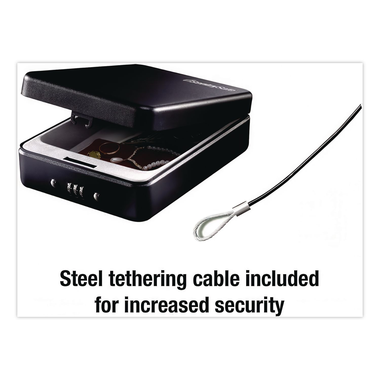 Portable safe offers versatile, on-the-go security. Roller-style, three-digit combination lock is one of the most reliable mechanisms available for portable lock boxes. Solid steel body and a soft interior lining ensure that your fragile, delicate valuables remain free from damage. Braided steel tethering cable allows you to attach the P005C to fixed objects for added security while traveling. Ideal for protecting your most valuable compact items: jewelry, storage devices, smartphones, wallets, keys and more. Outer Width: 5.9″; Outer Depth: 8″; Outer Height: 2.6″; Capacity (text): 0.05 cu ft.