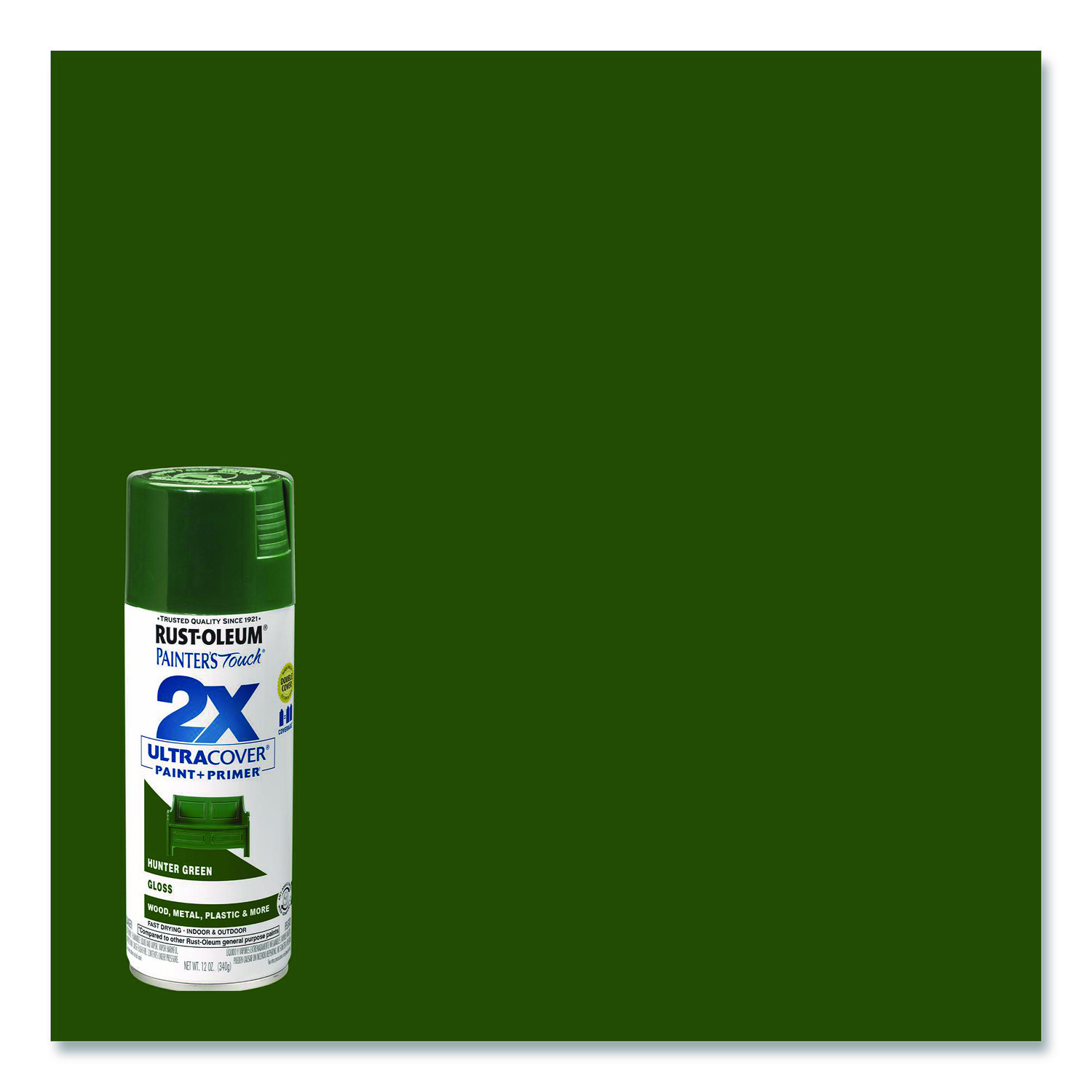 Painter’s Touch® 2X Ultra Cover® contains technology that provides twice the coverage on wood, metal, most plastic, wicker and more. It covers surfaces with less spray passes, allowing projects to be completed faster and easier. Any angle spray feature allows you to spray in any direction, even upside down. Fast drying. Paint Sub-Category: Spray Paint; Intended Application Environment: Interior/Exterior; Finish/Sheen: Gloss; Color(s): Hunter Green.