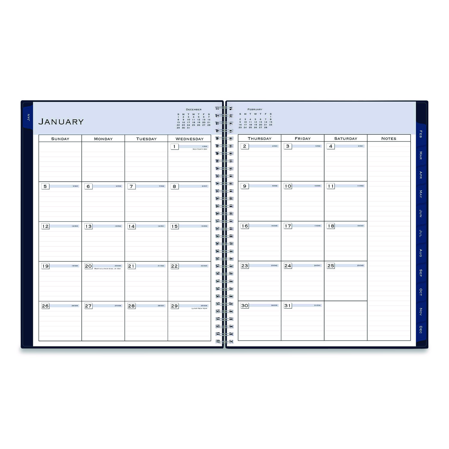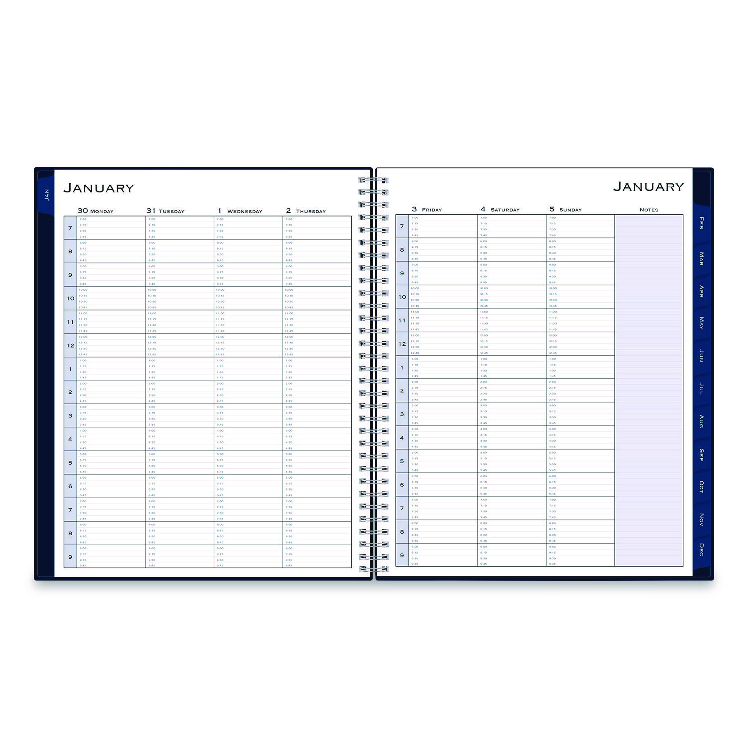 Add sophisticated appeal to appointment scheduling and planning tasks with the “Passages” sleek and professional weekly appointment book and monthly planner. Weekly spreads feature an extended, vertical column format for meticulous appointment scheduling across the whole week, including Saturdays and Sundays, plus an eighth ruled column for additional notes and comments. For longer-range planning and additional notetaking, the tabbed monthly views deliver a standard, daily block format as well as their own ruled notes column for lists and comments on every other page. Six past-year, untabbed monthly spreads help you transition into the new year, while additional pages for yearly goals, contacts, important dates and more help you stay on track. Durable, twin-wire binding allows the book to lie flat when open, and thick, high-quality paper stock minimizes the potential for ink bleed through. Dated: Yes; Academic Year: No; Calendar Format: Weekly/Monthly; Calendar Spread Format: One Week per Two-Page Spread; One Month per Two-Page Spread.